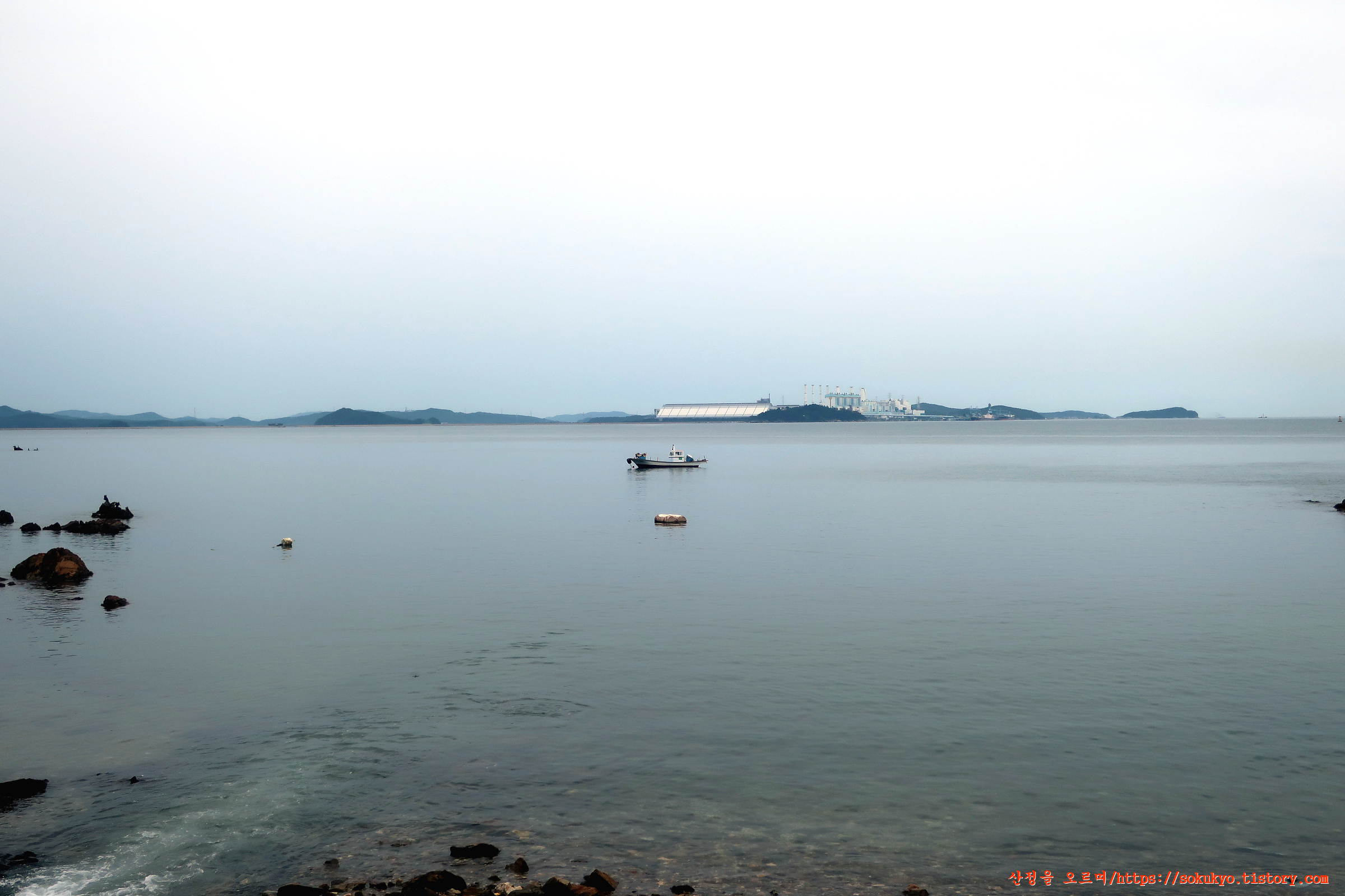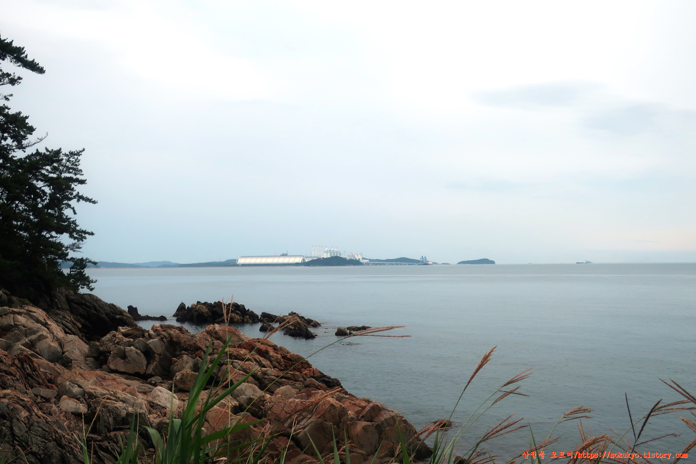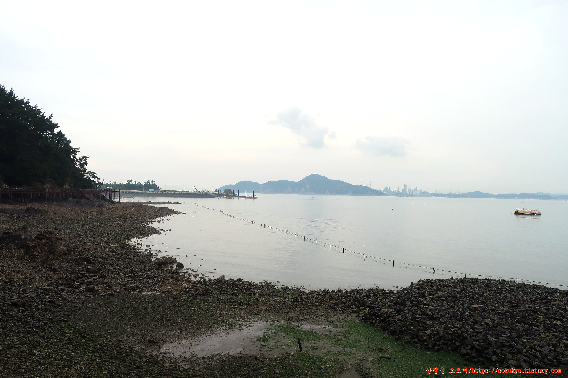 바다 건너편 충남 서산시 대산읍의 산업단지와 황금산이 보이네요
