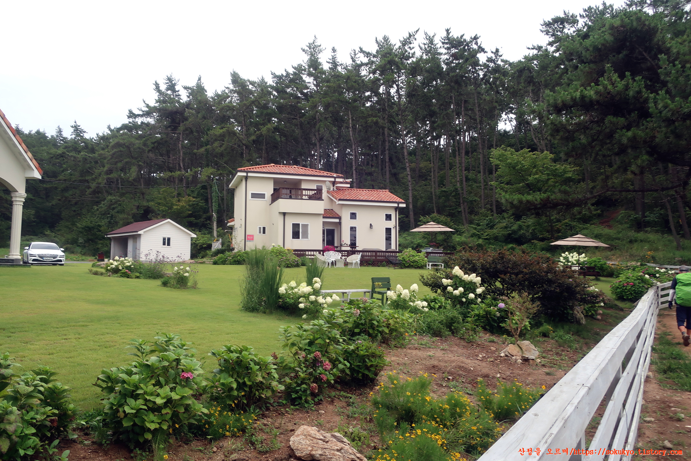 15:58 임도삼거리에서 우측 산길을 내려서면 '까사쏠피노 펜션'앞에 닿습니다.