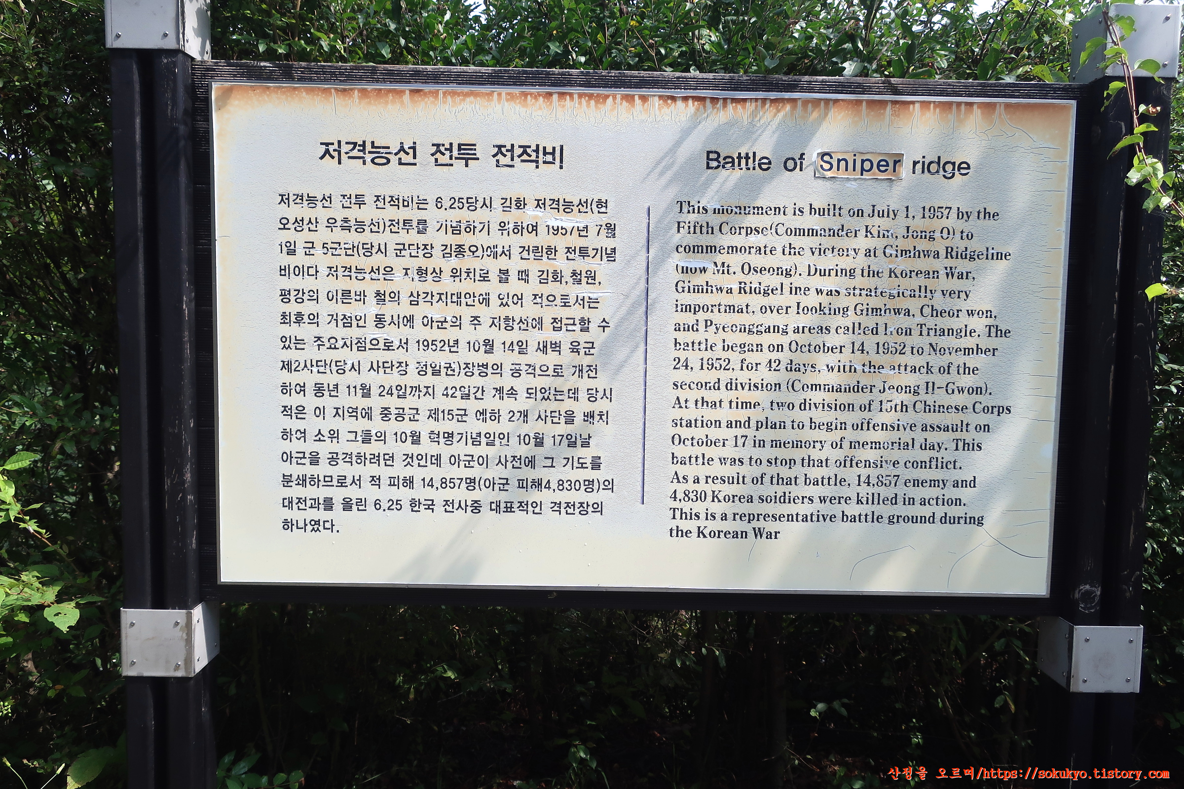 철원군 김화읍 청양4리 쉬리공원 내에 있는 '저격능선전투전적비' 앞에 섭니다.