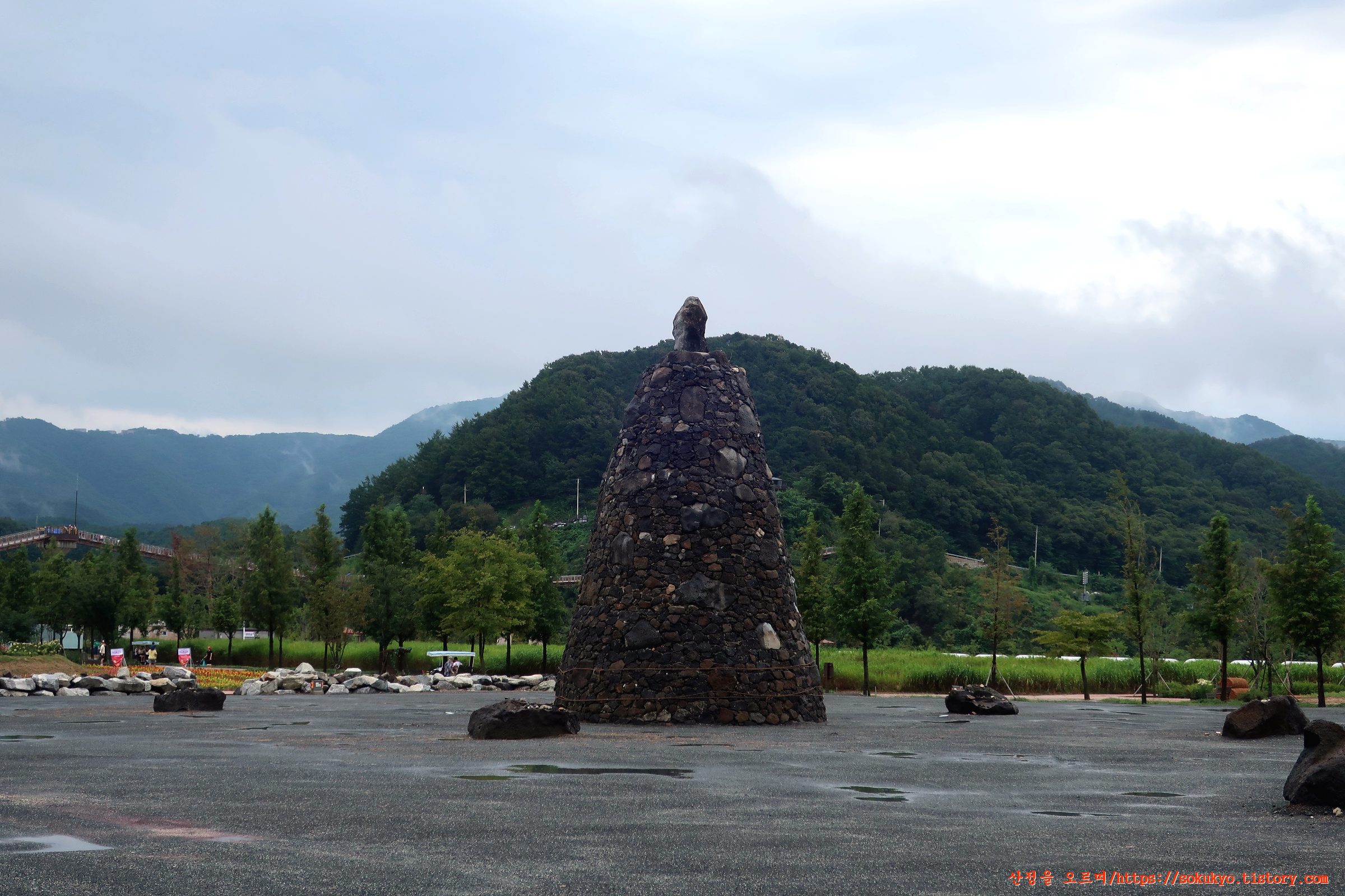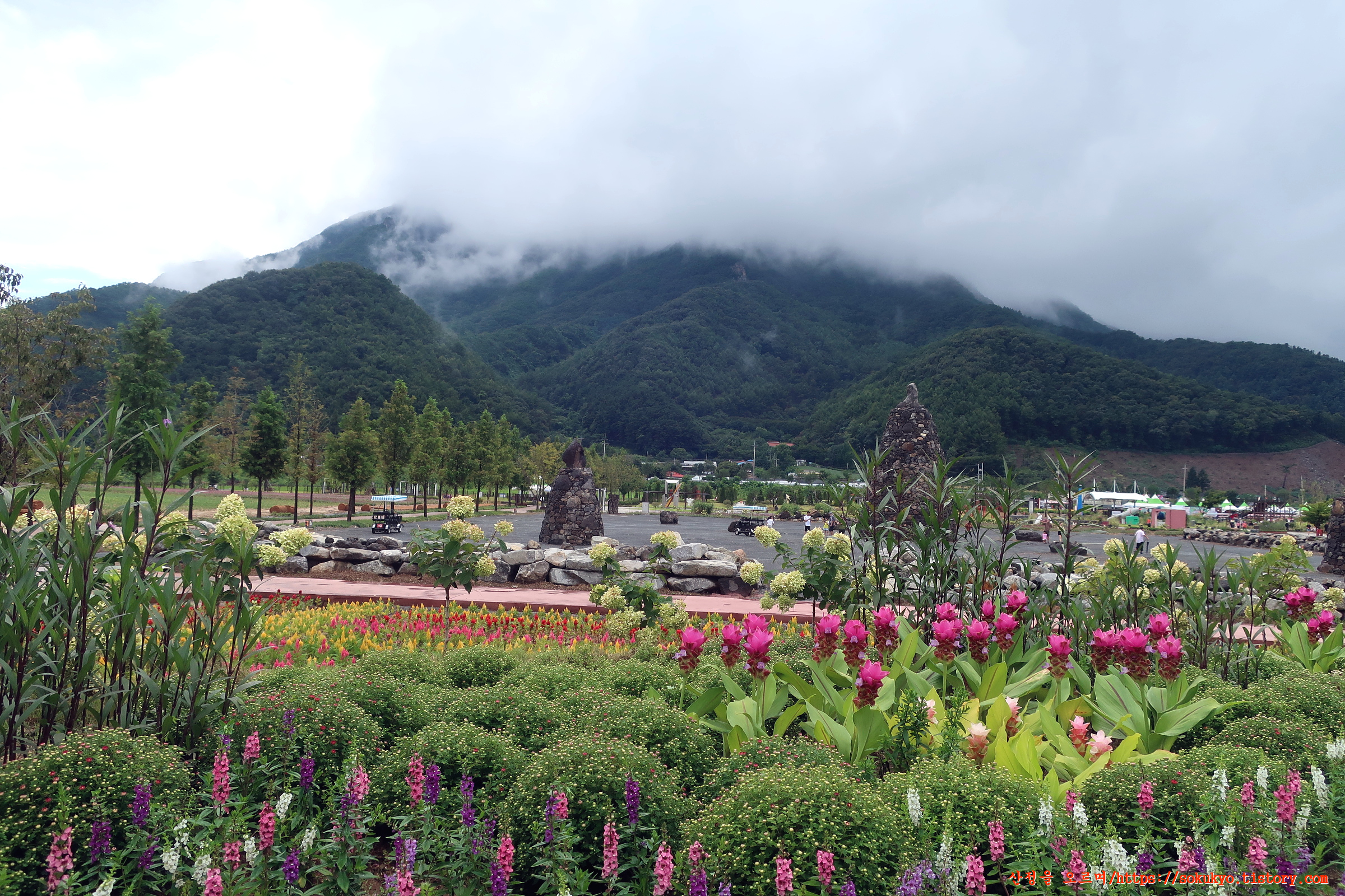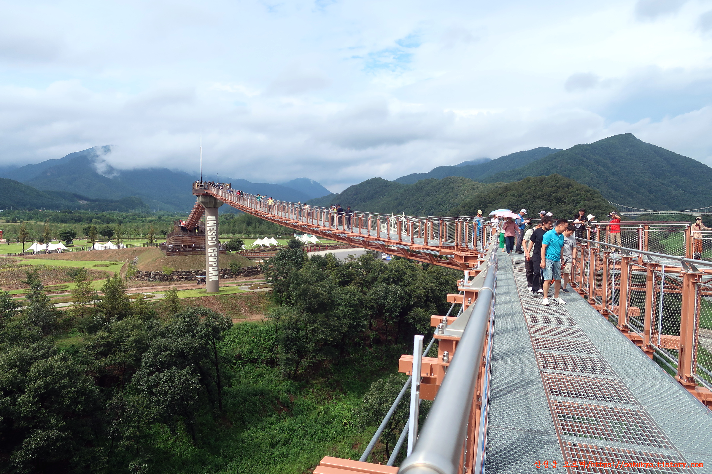한탄강 Y자 출렁다리로 가면서 뒤돌아 본 가든 페스타와 구름에 덮힌 종자산 풍경