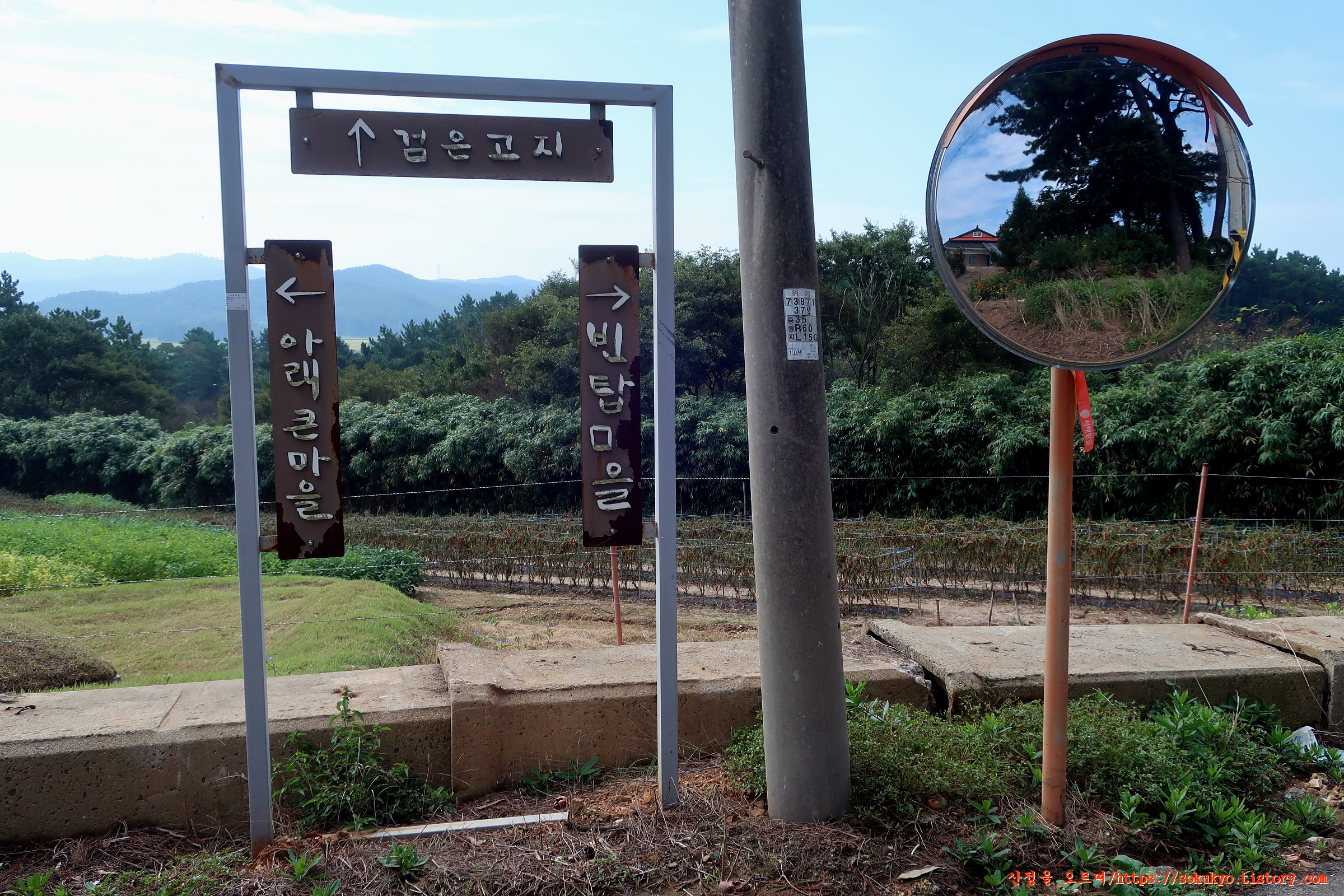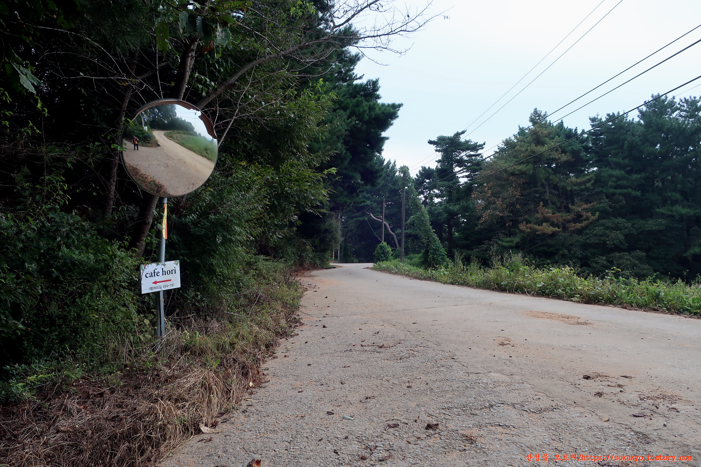 세멘트 포장의 '밤머리길'을 오르면 고갯마루턱 삼거리(거울반사경)에 닿고