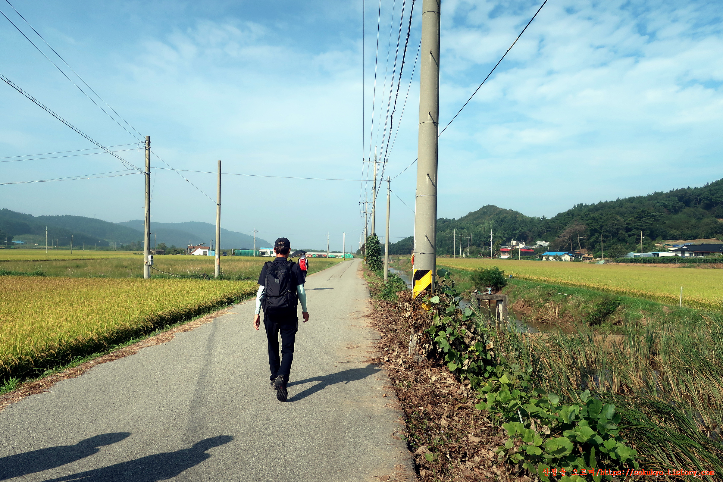 산모퉁이를 돌아가는 농로를 따라 우측의 황금빛으로 변하는 벌판을 보며 걷습니다.