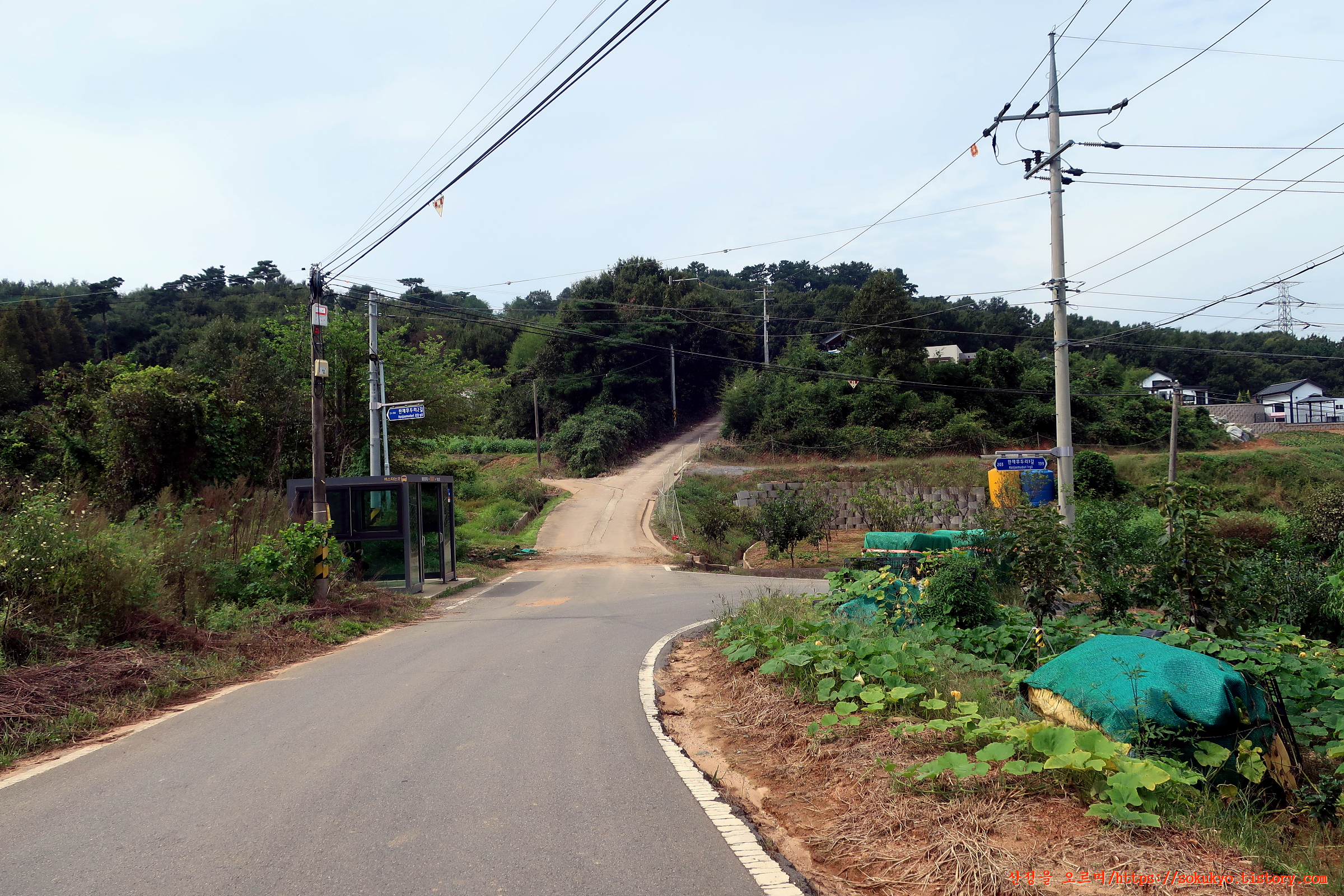 2차선 차도(왕산이로)를 따라 약100m쯤 걸으면 만나는 삼거리에서
