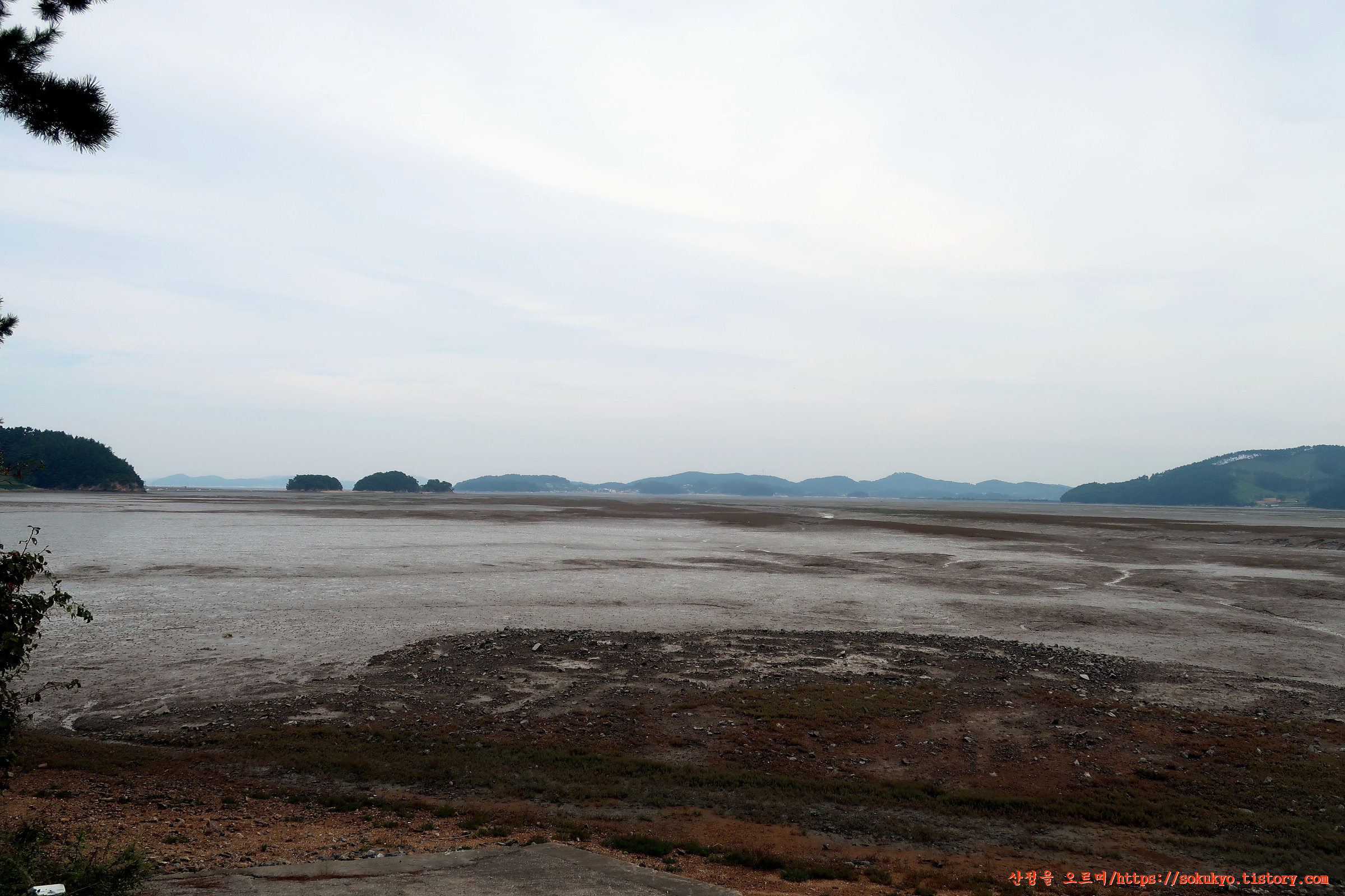 방조제 위에서 바라본 장구섬 앞쪽의 '가로림만'과 갯벌 풍경