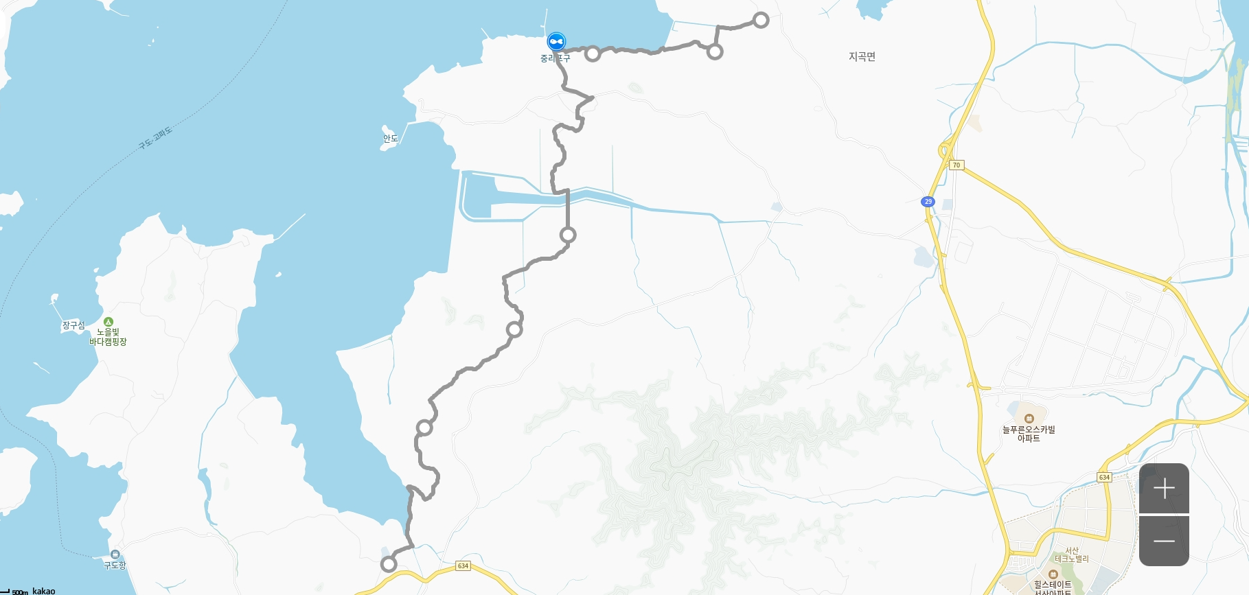 - 76코스 종점 : 충남 서산시 팔봉면 호리 629-5(구도항 공중화장실 앞)