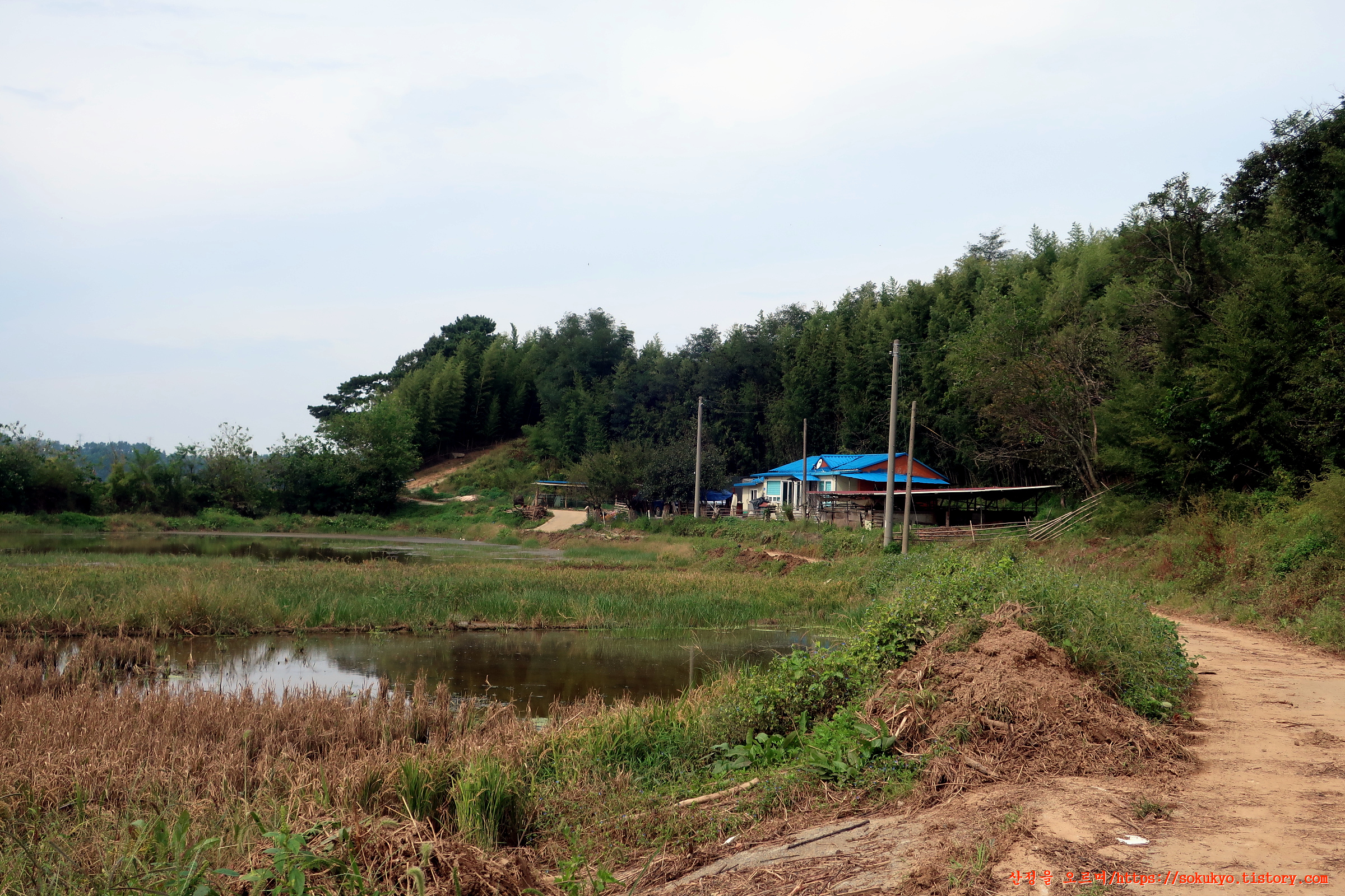 좌측으로 휘어져 농로를 따라 가면 논 가운데 있는 농가를 지나고