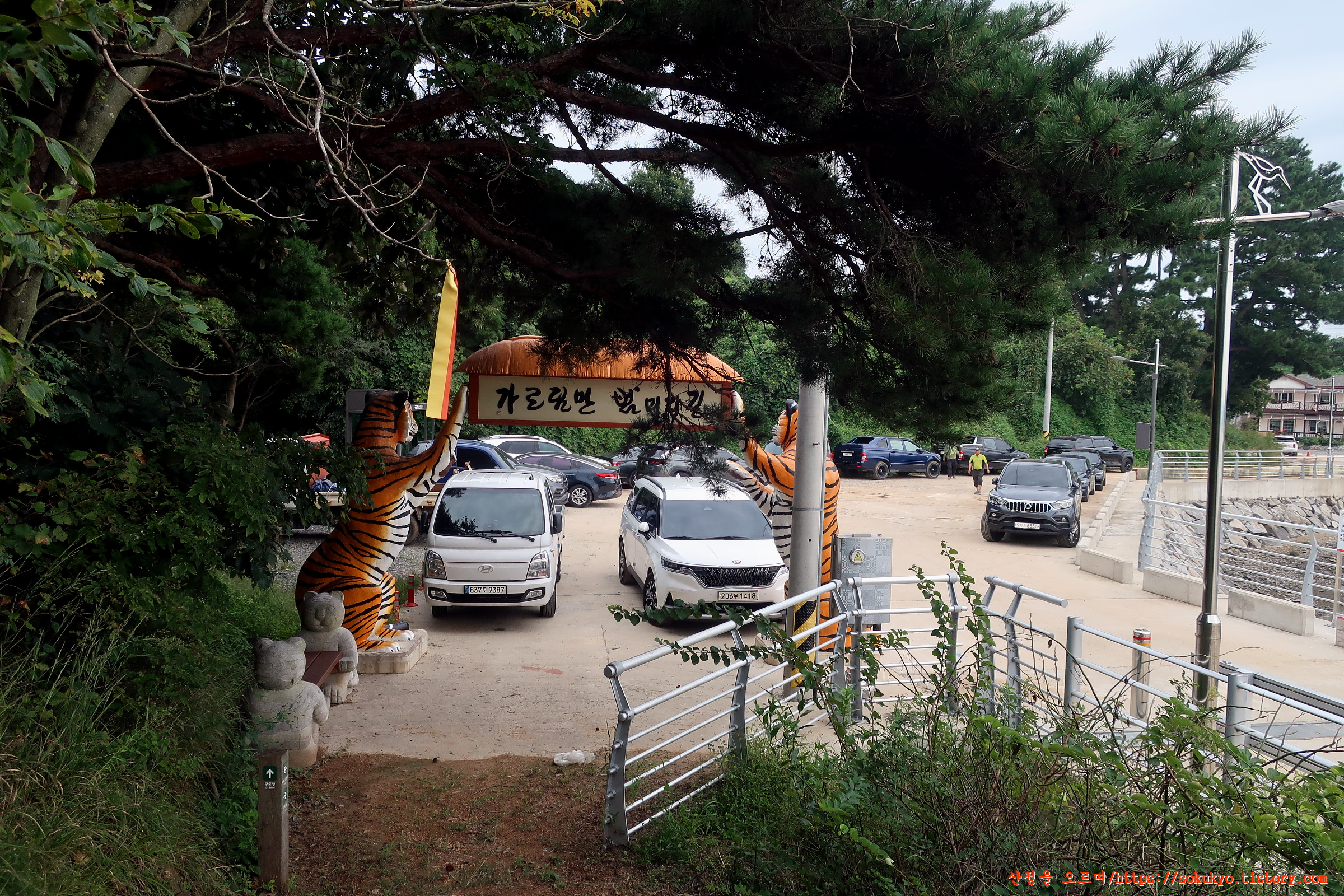 호랑이와 떡파는 소녀상 뒤쪽의 가로림만의 '고부레' 해변에 있는 '옻샘'