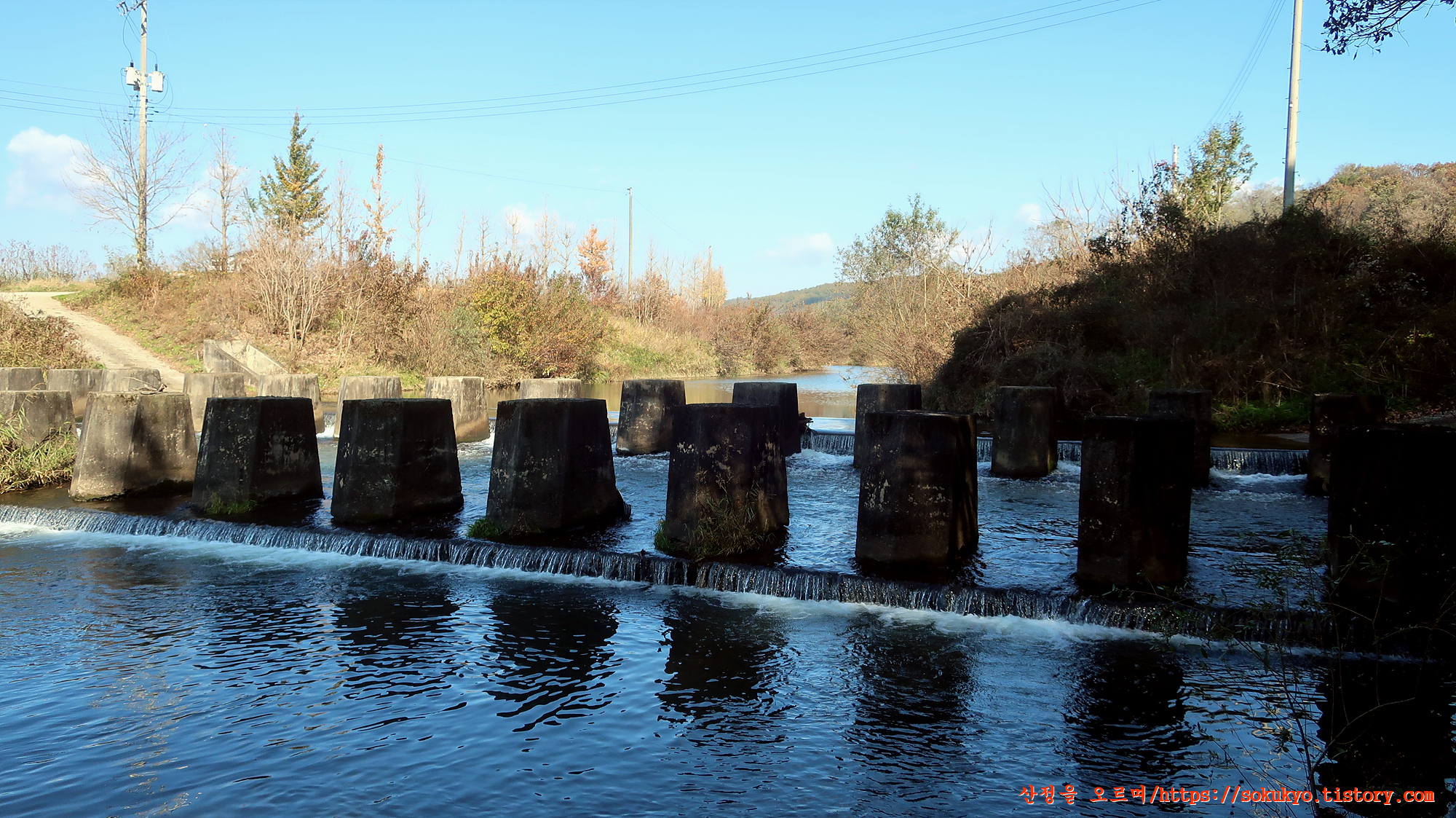 대교천 바닥에 세워져 있는 콘크리트구조물을 보며 지납니다.