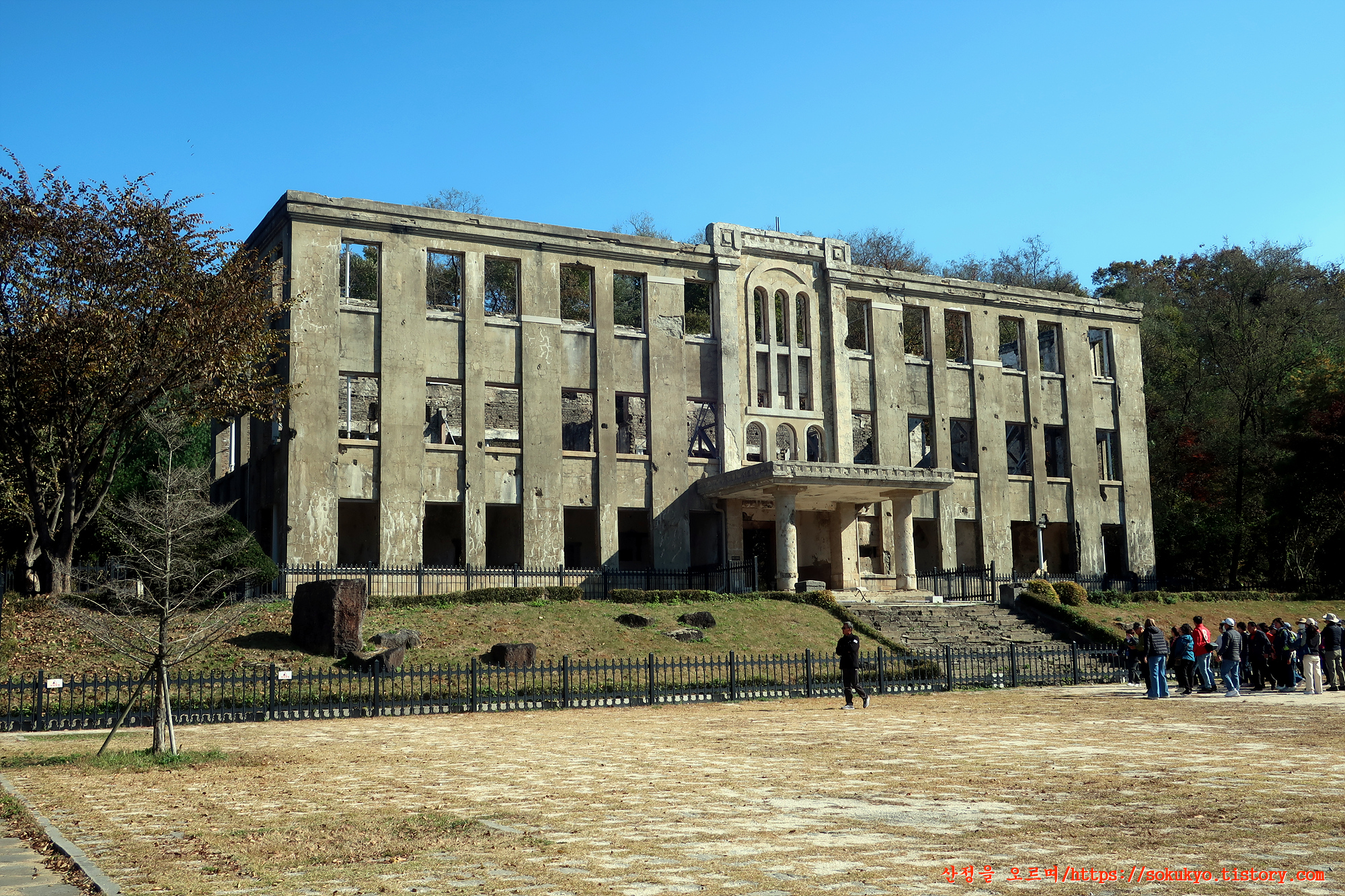 건물 전체가 검게 그을리고 포탄과 총탄 자국이 촘촘하게 나있다.
