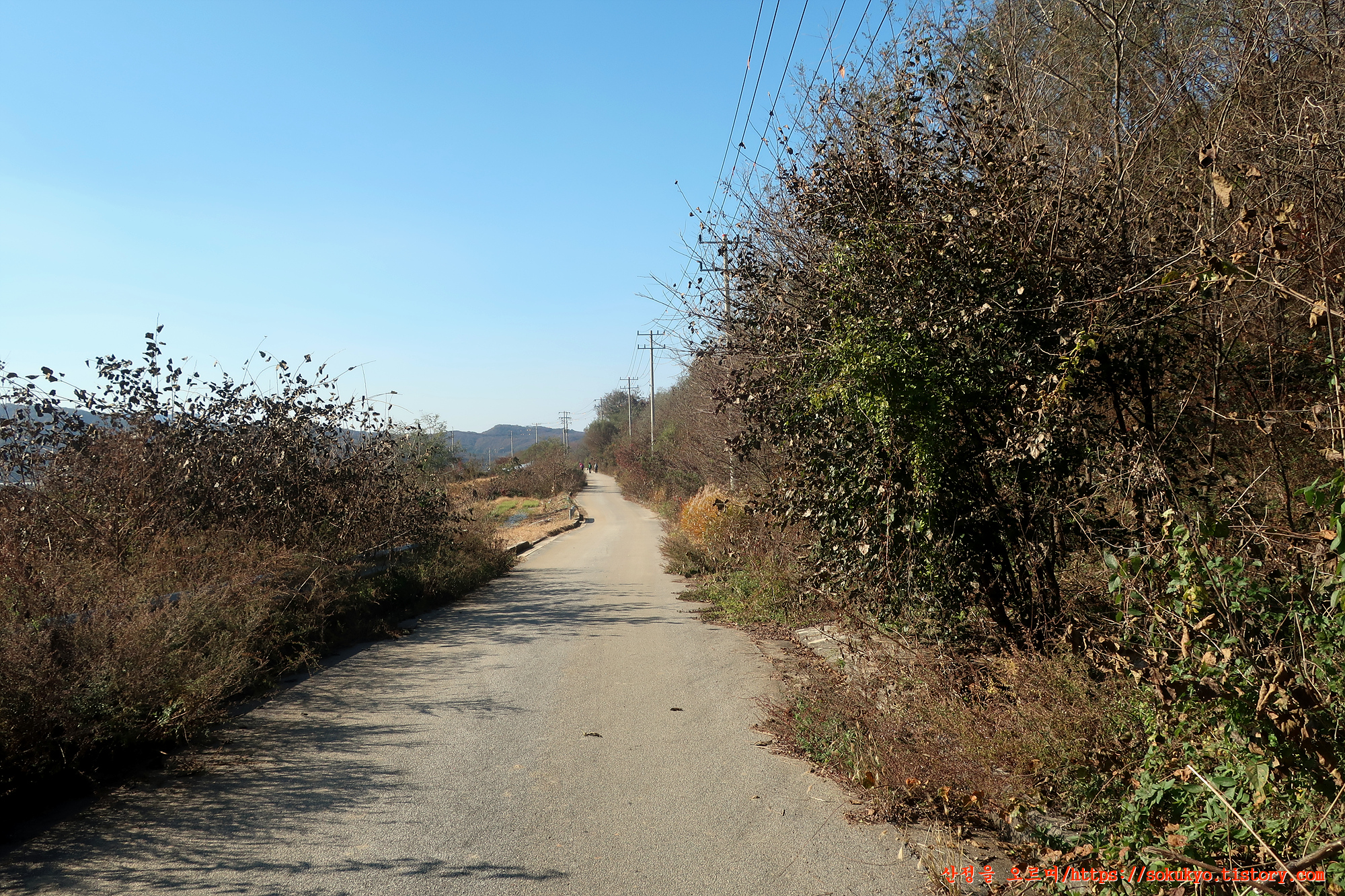 농로 전방으로 보이는 나즈막한 철원읍 사요리의 고갯길을 넘어갑니다.