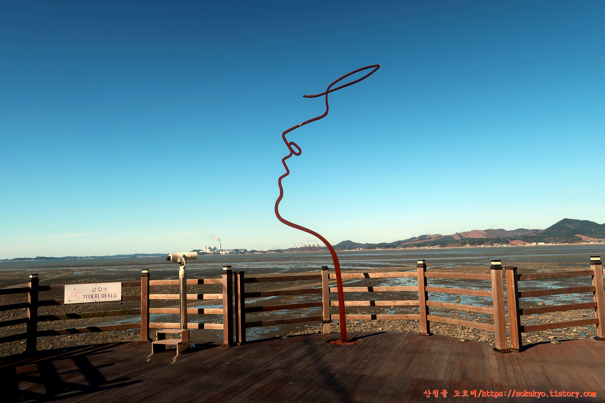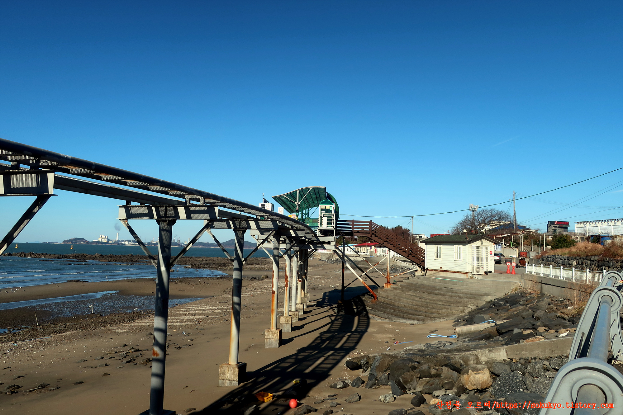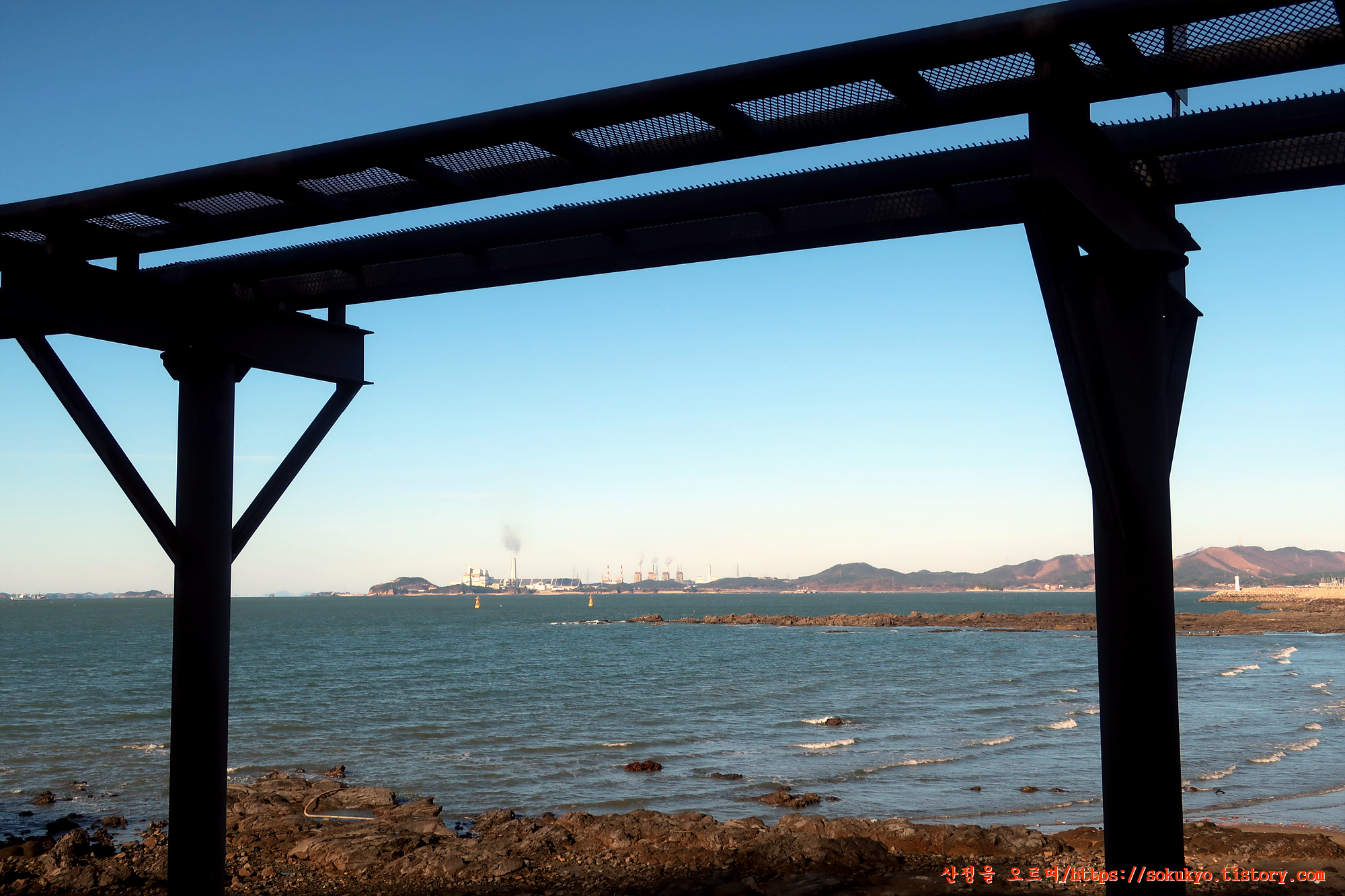 스카이 바이크 교각 사이로 바다 건너편으로 보이는 '신보령발전단지'