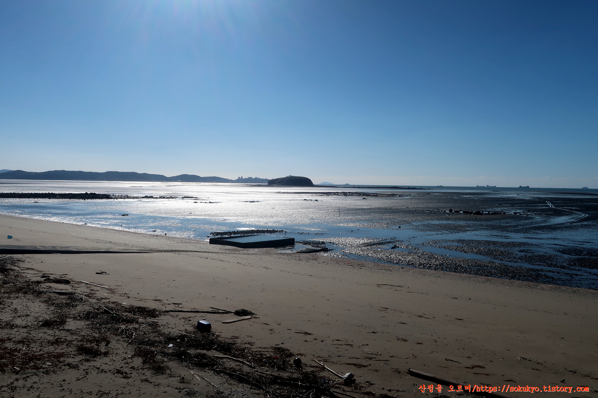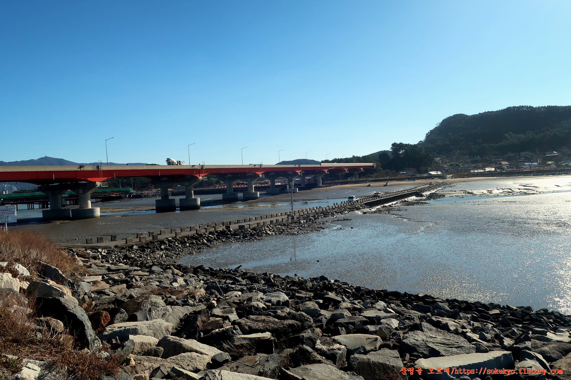 만조시에는 계속 방조제위를 지나 '남대천교'를 건너야 합니다.