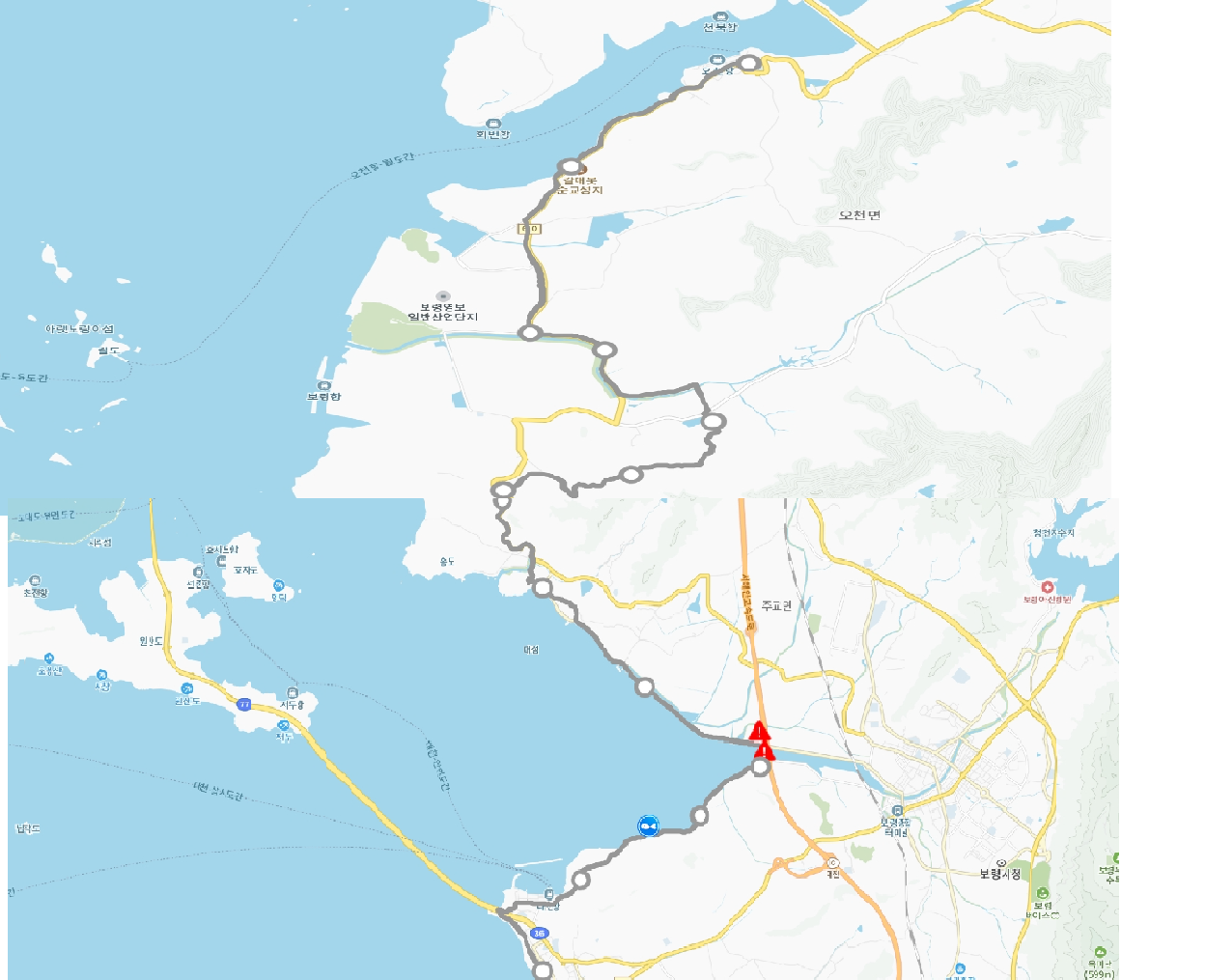 - 충청수영성-3.9km-보령LNG터미널-2.2km-오포버스정류장-2.6km-깊은골버스정류장