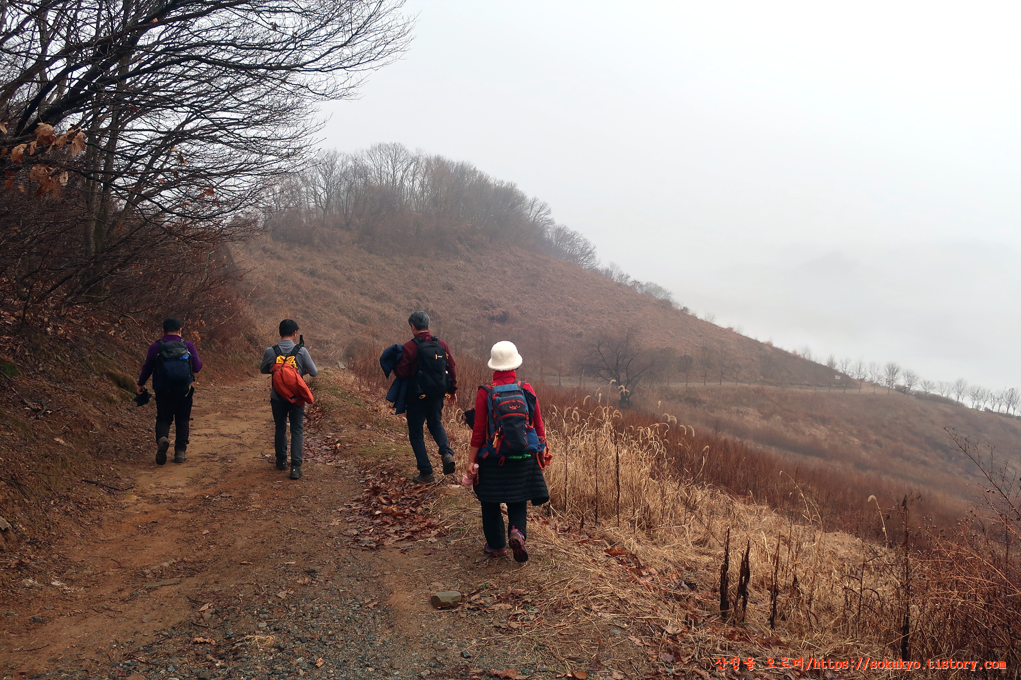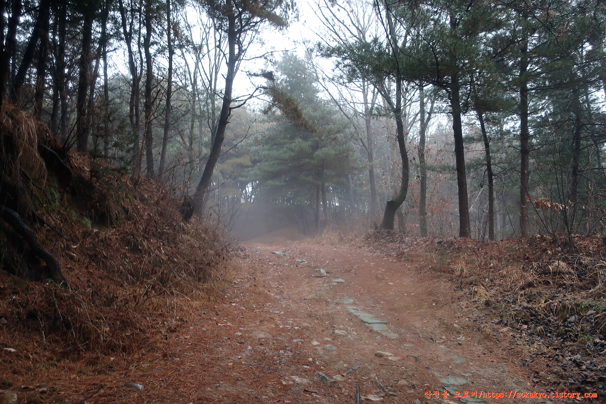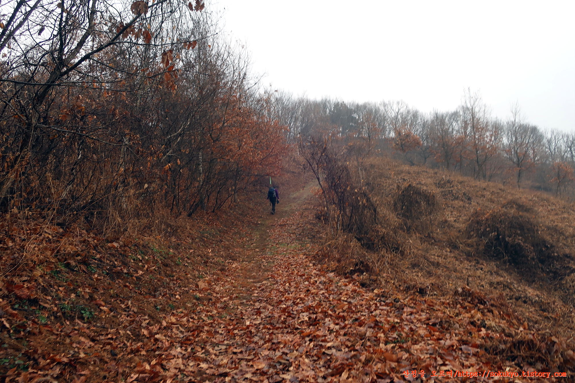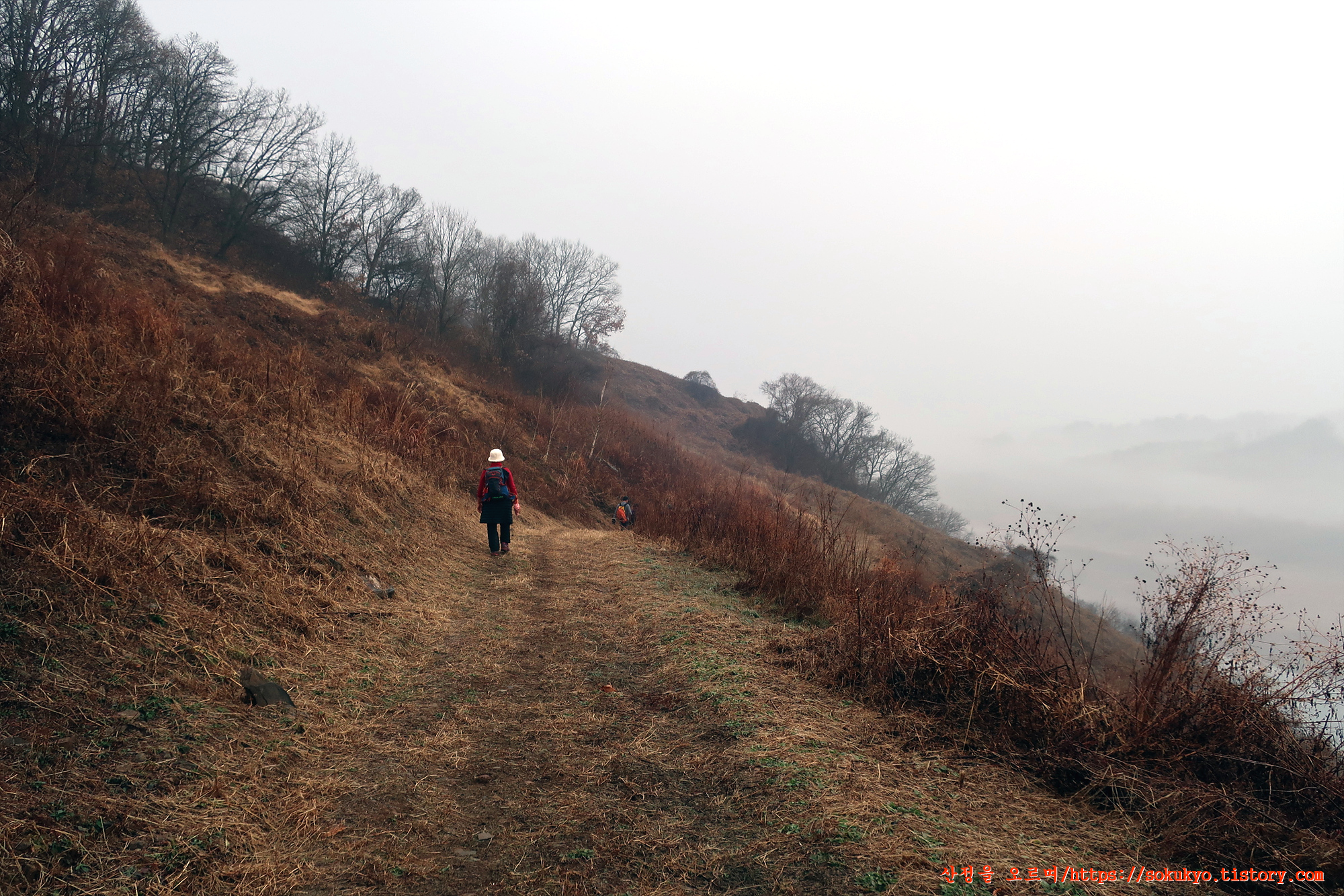 비포장 산길을 지나는 우측으로는 그리팅맨이 서 있는 옥녀봉이 흐릿하게 보이네요
