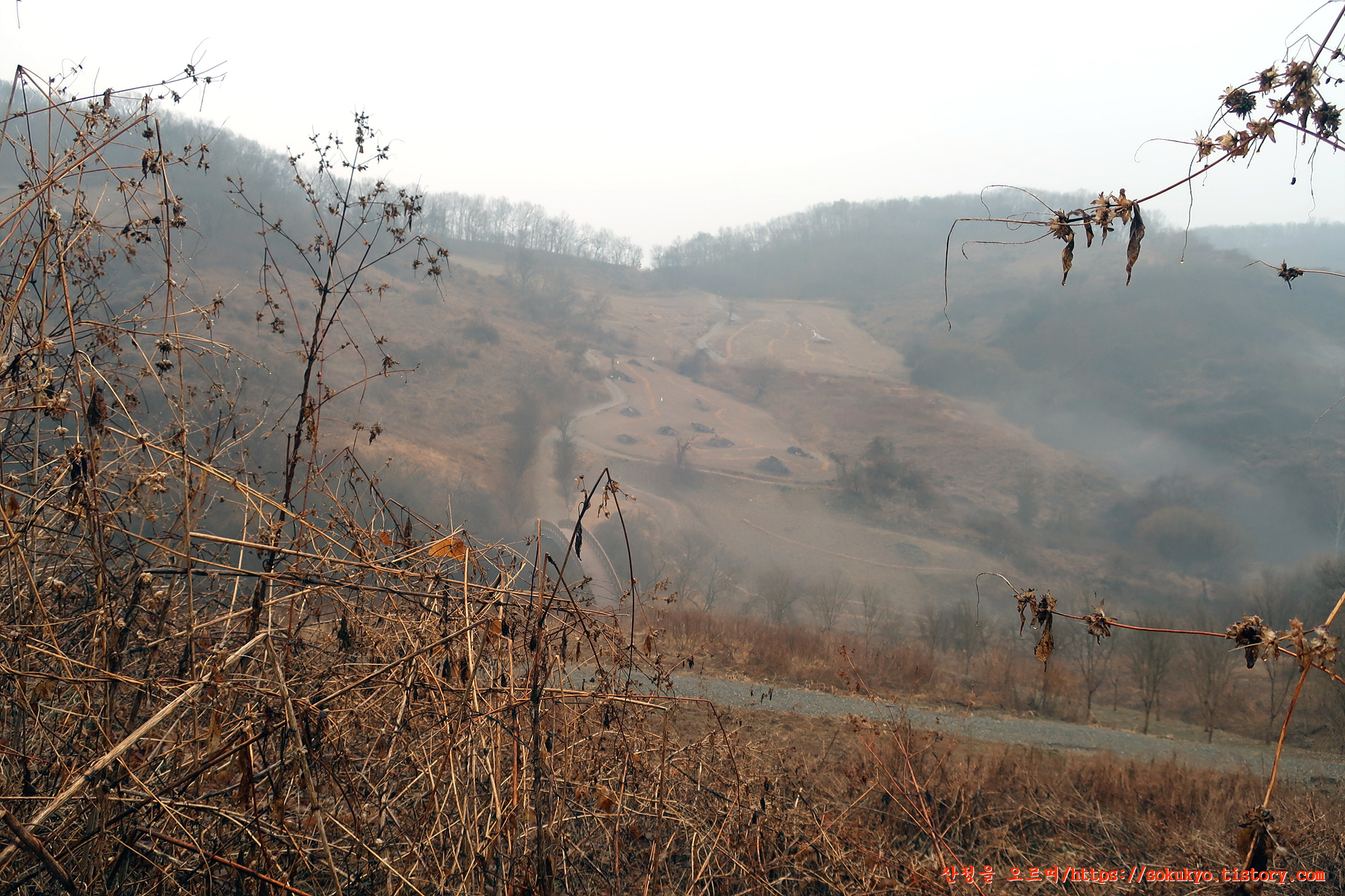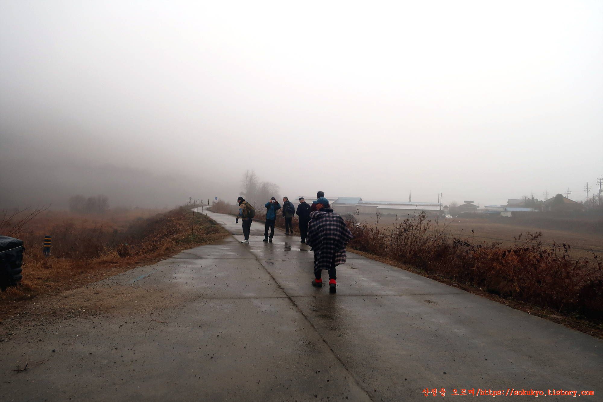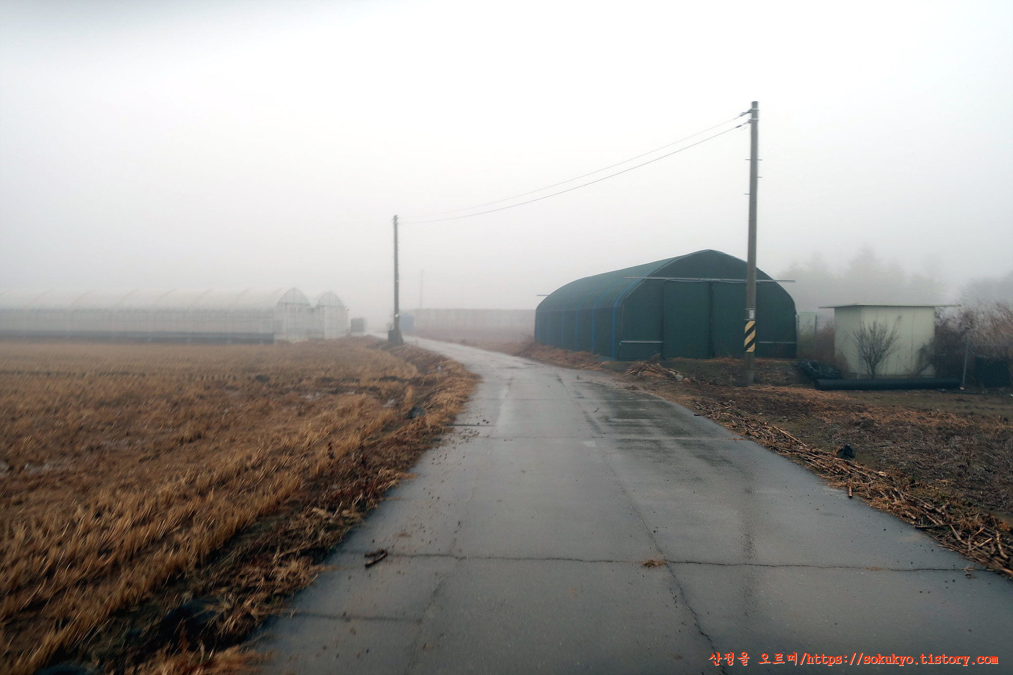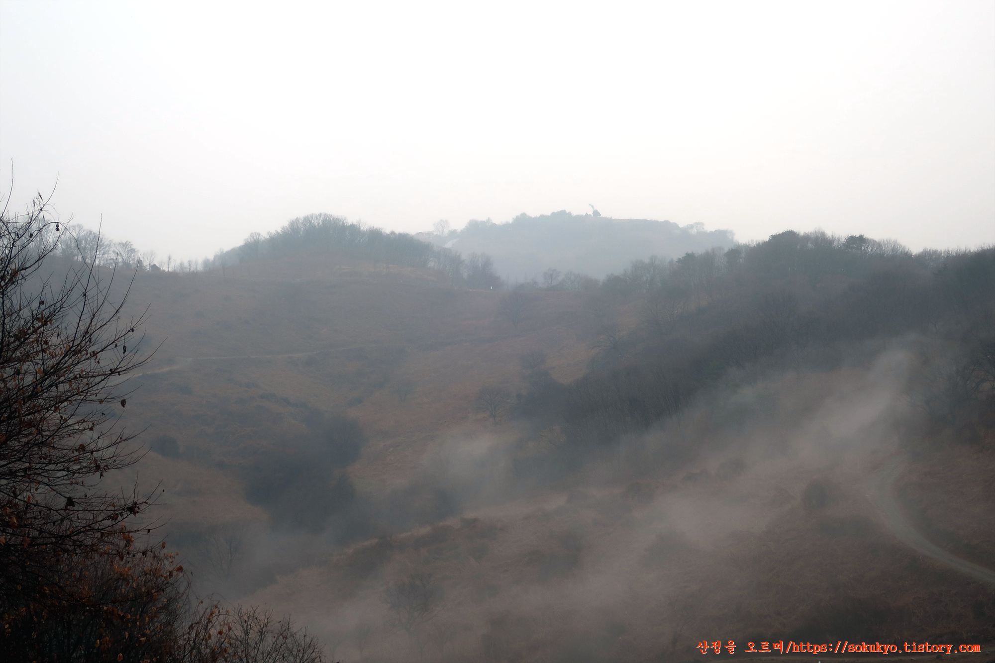 비포장 산길을 지나는 우측으로는 그리팅맨이 서 있는 옥녀봉이 흐릿하게 보이네요