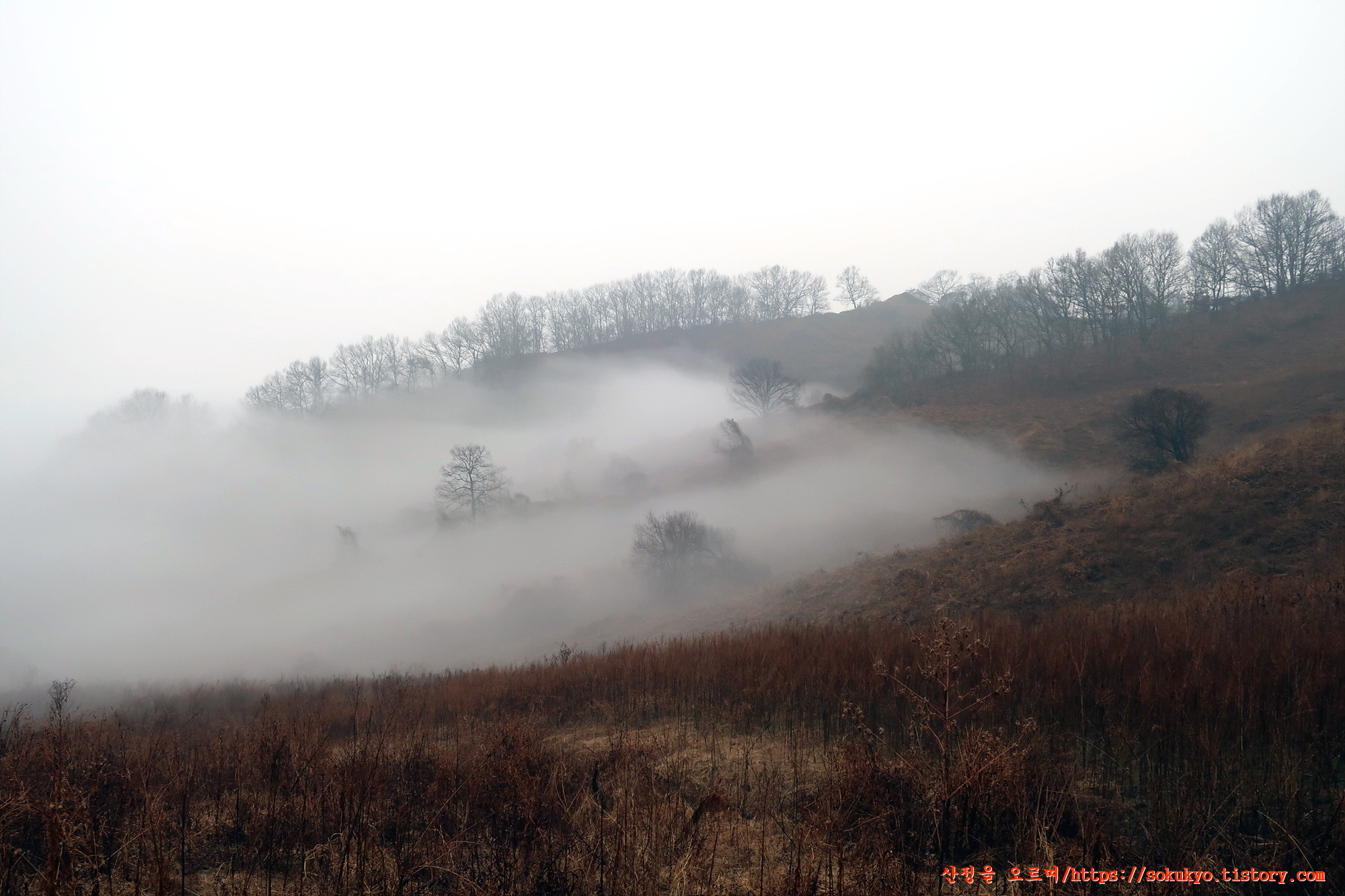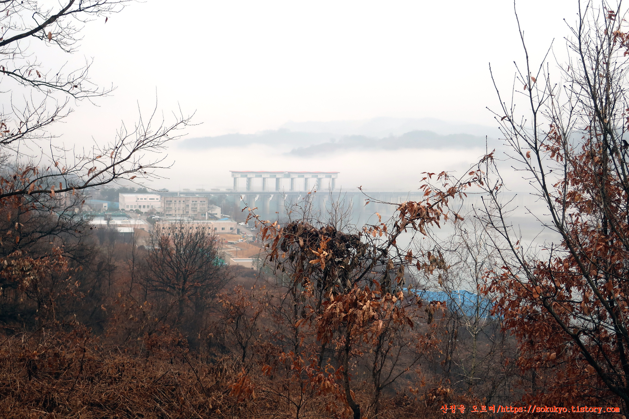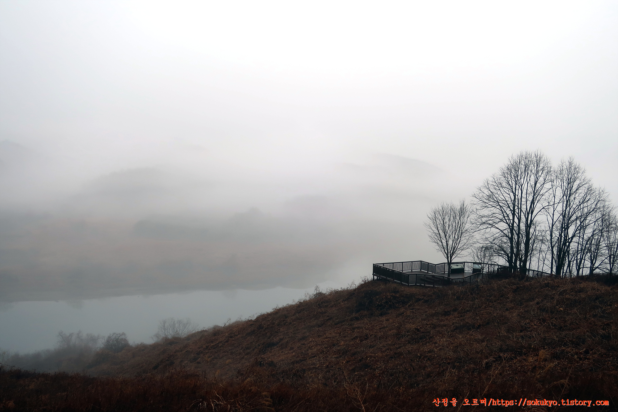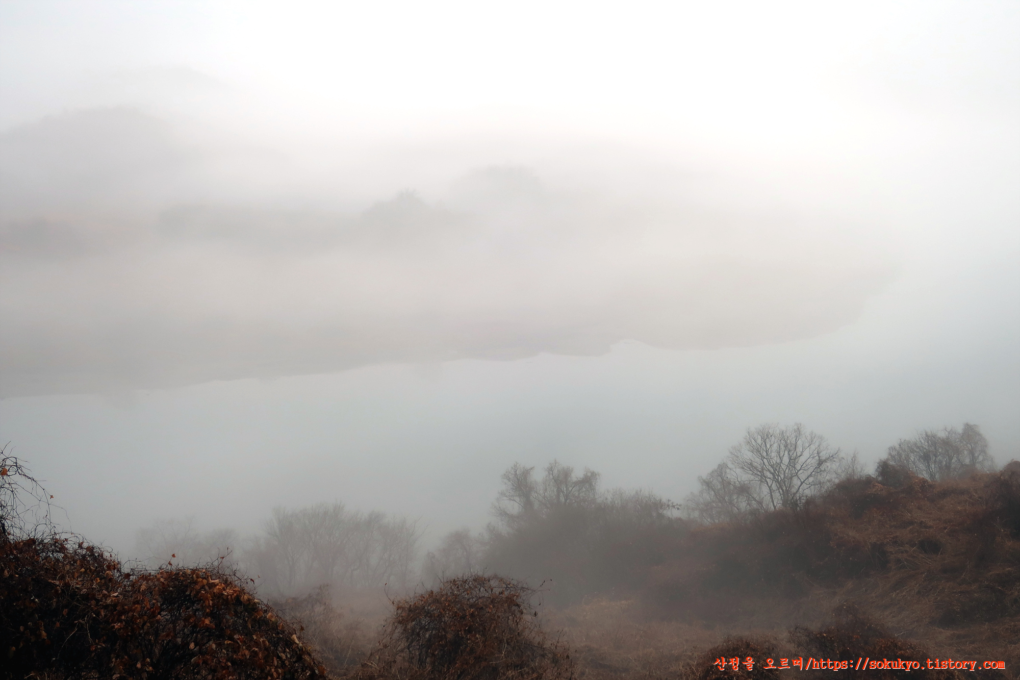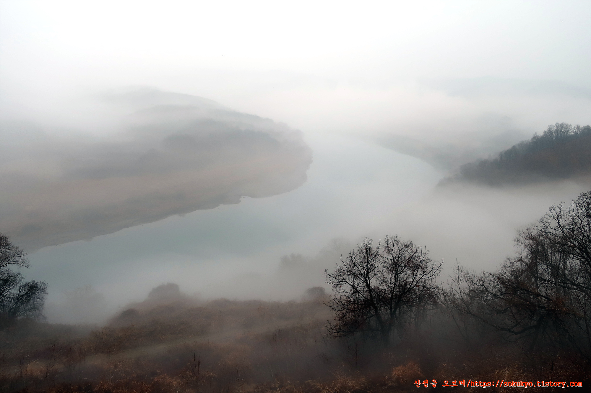 산아래쪽의 임진강에서 부터 안개가 덮혀 오는 풍경이 보입니다.