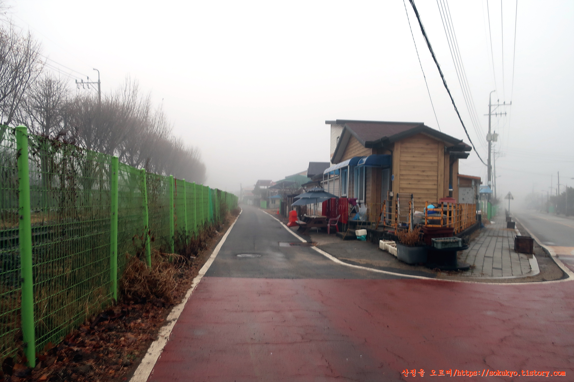 상리초입구의 철길 건널목을 건넌후 급 좌측으로 휘어져 철길옆의 파란철망울타리를 따라 걷습니다.