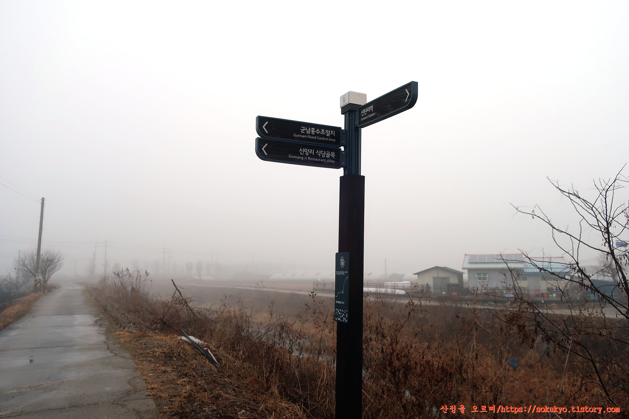 2차선도로인 '군중로'를 따라 걷다가 이정목이 있는 곳에서