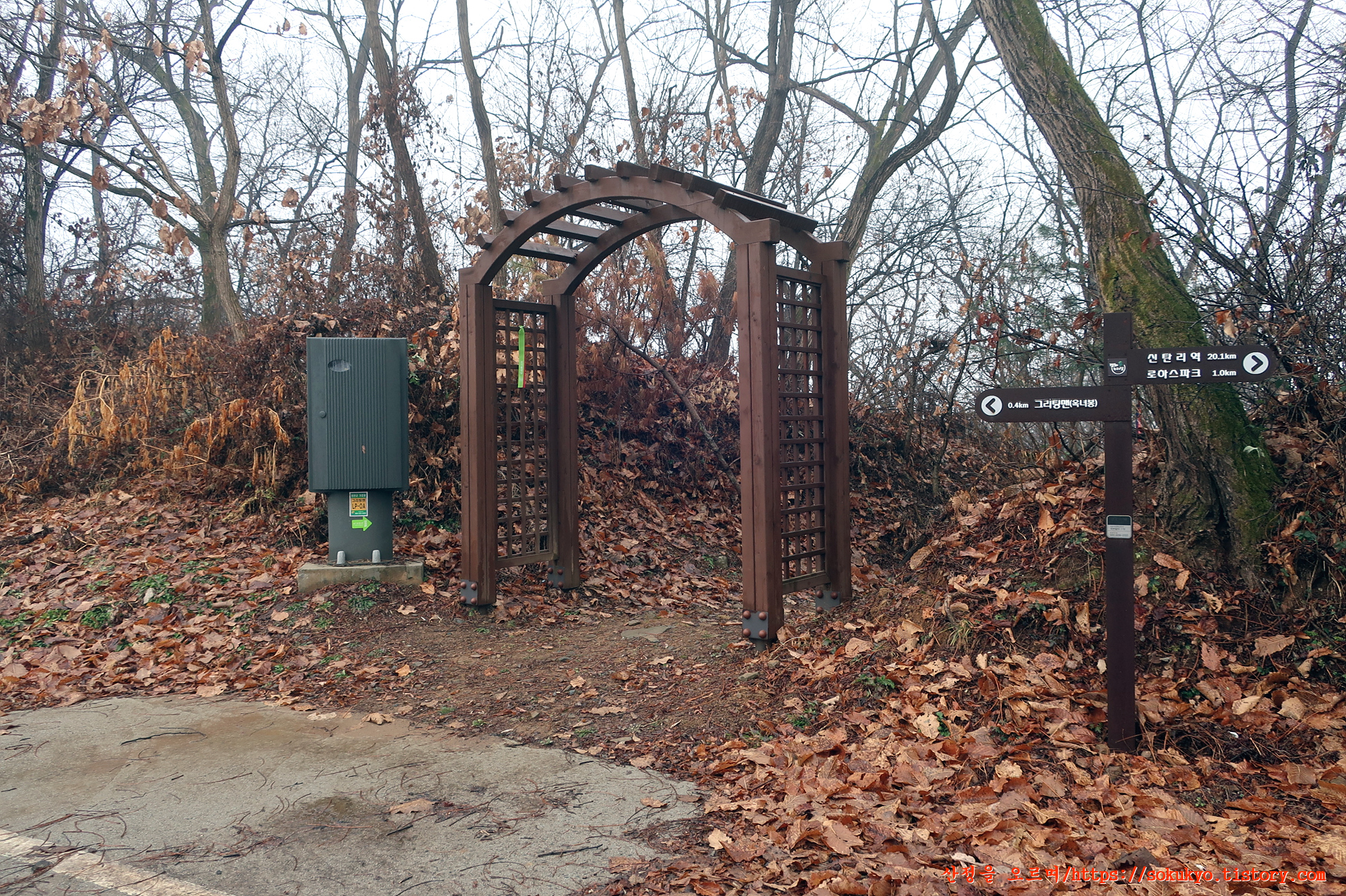 세멘트임도에 닿으면 이정표와 아취문을 만나게 됩니다.