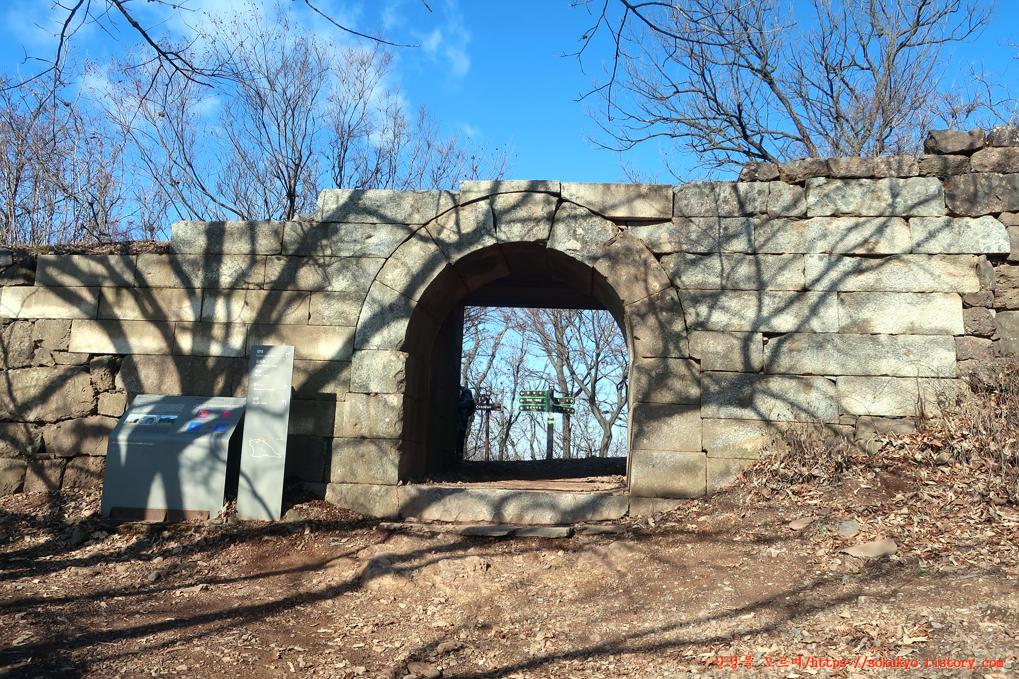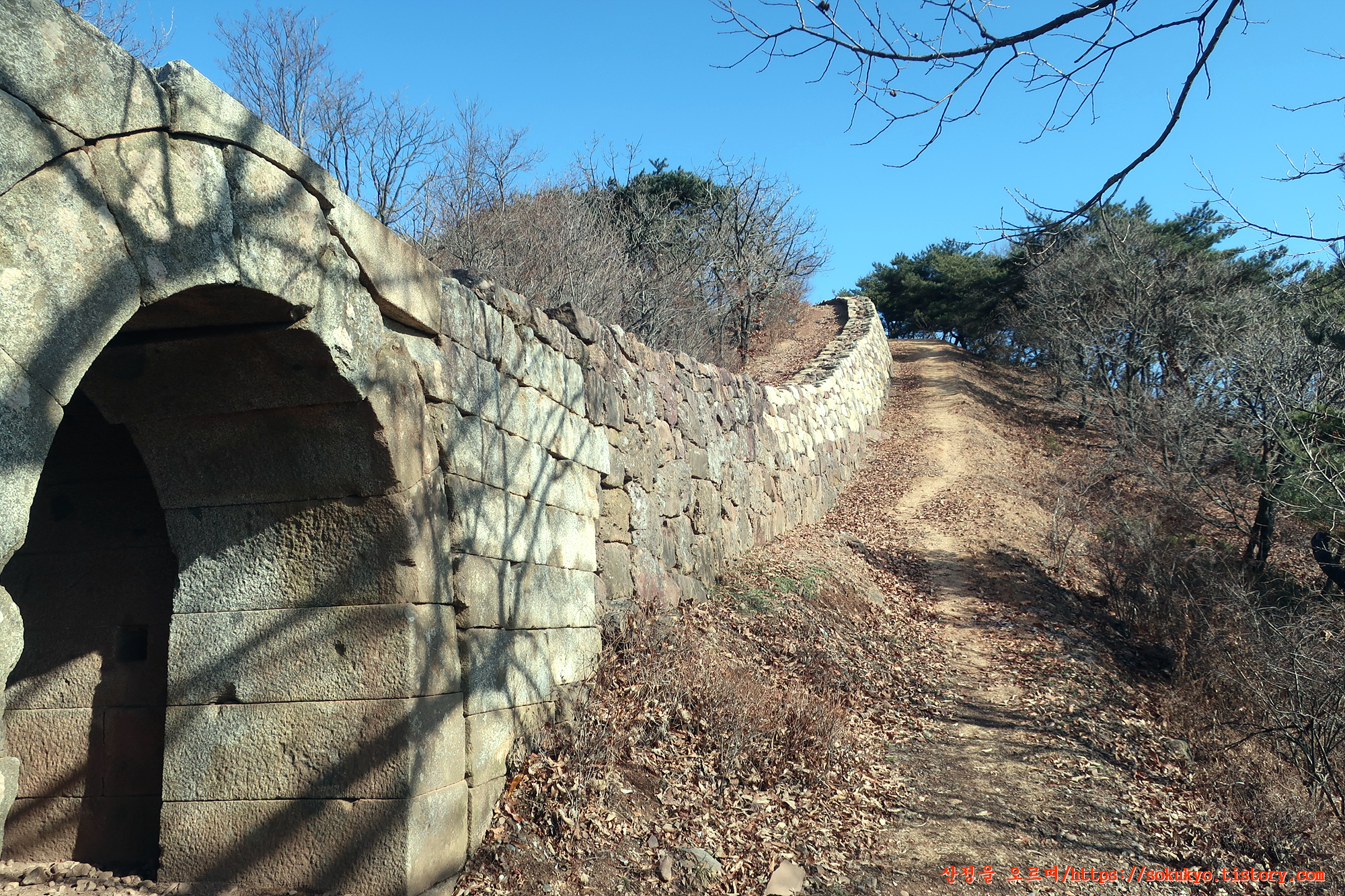 성곽옆으로 내려가는 등로를 따라 문수산성 남문으로 향합니다.