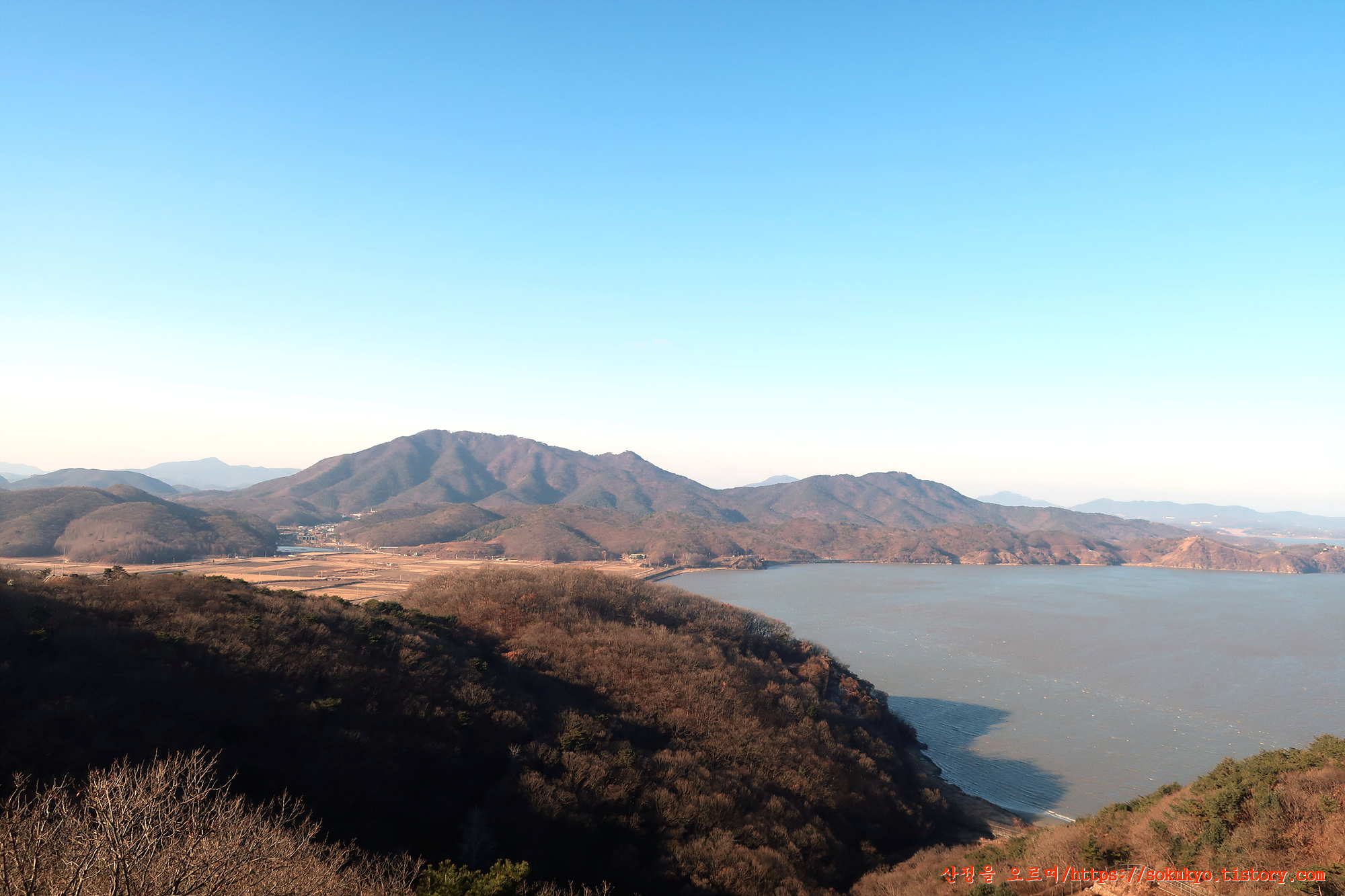 조강저수지와 그앞의 애기봉 전망대...멀리 김포시내와 북한산쪽 풍경