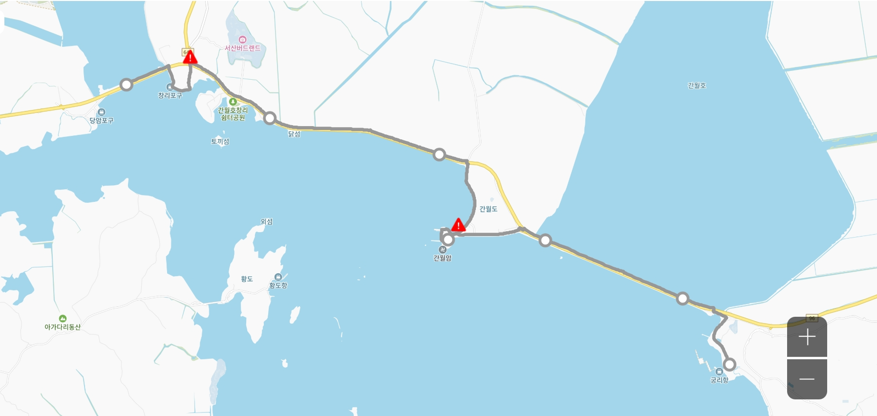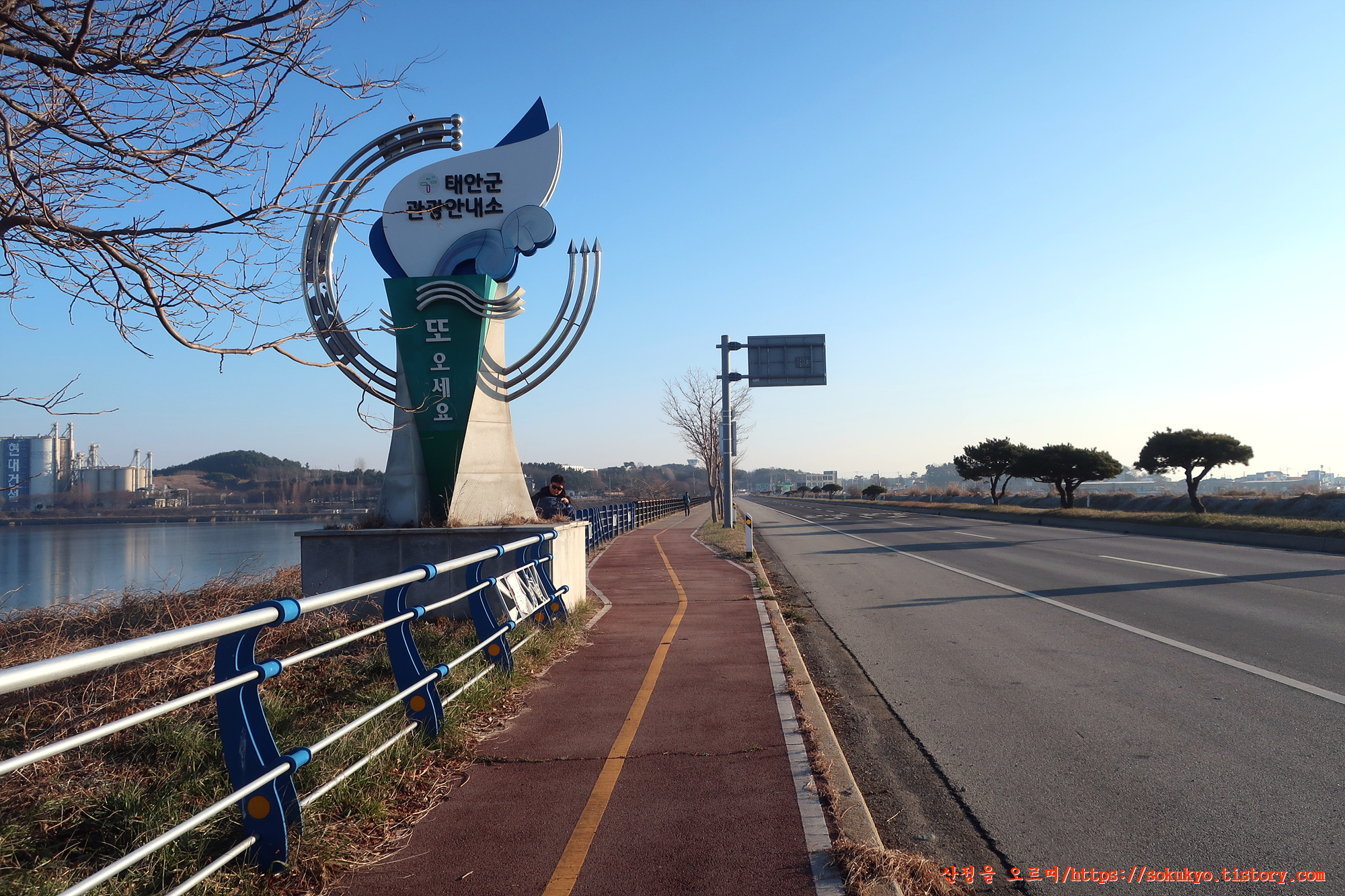 * 태안관광안내소-3.2km-천수만쉼터-4.5km-간월암-3.0km-간월호철새탐조대-2.5km-궁리항