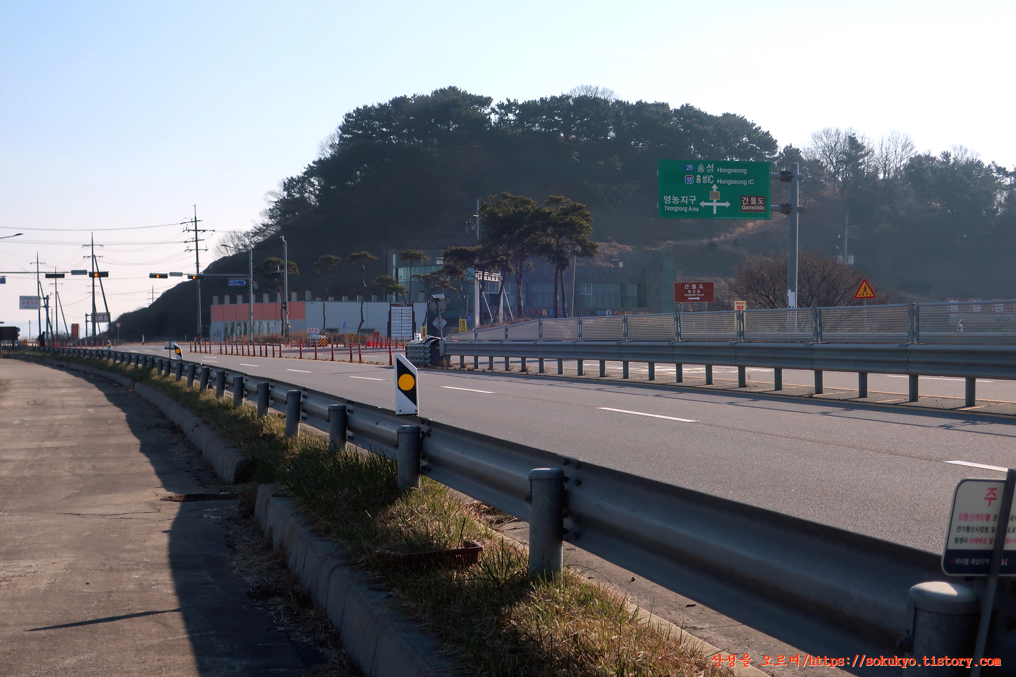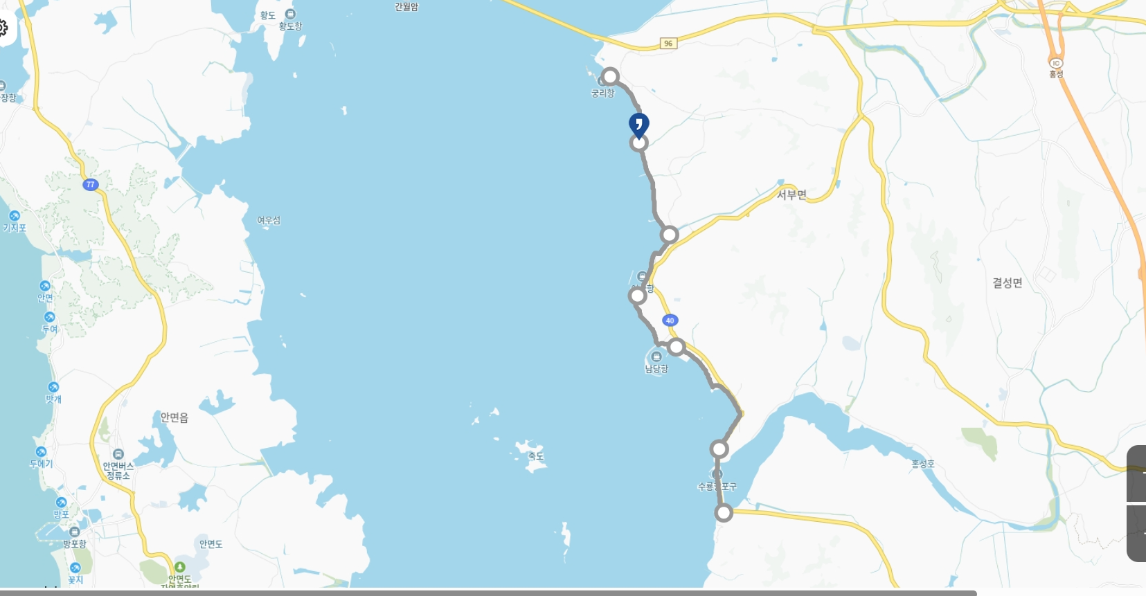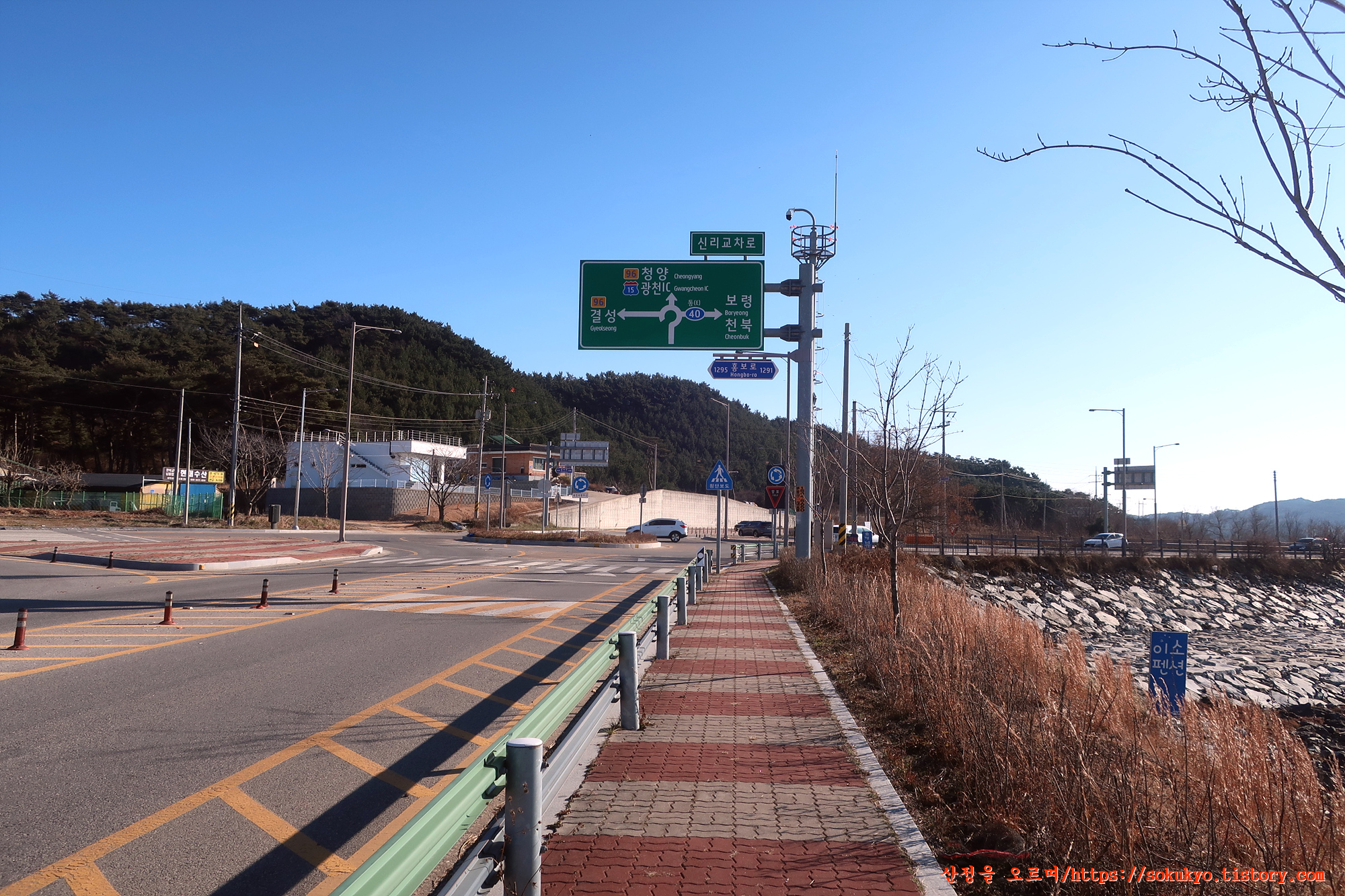'어사항'을 거쳐 '신리 교차로'에 닿고, '신리교차로'에서 우측으로 휘어져 '홍성방조제'를