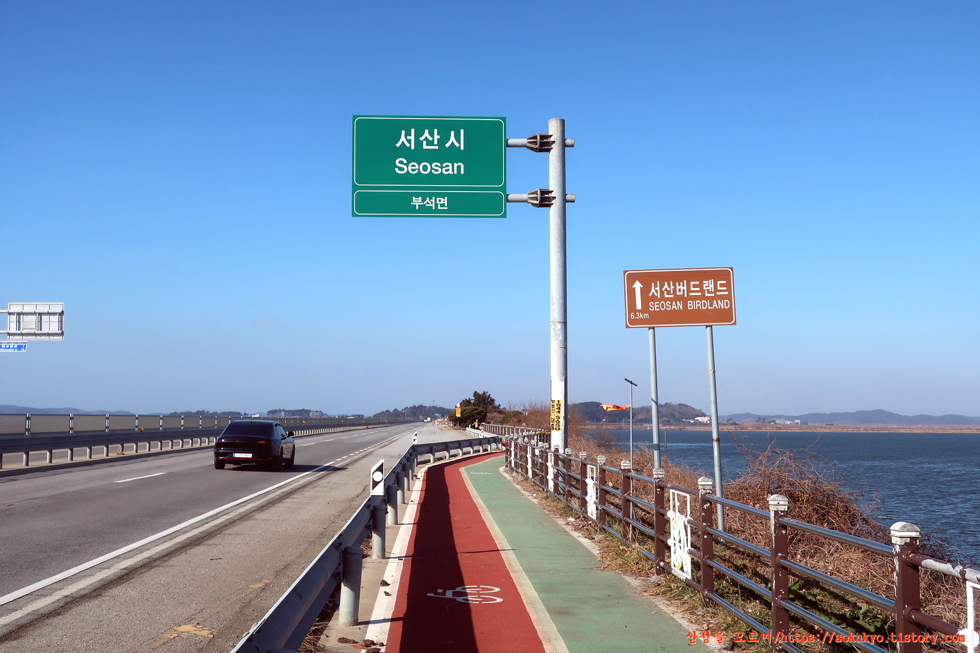 서산버드랜드 입구를 지나서도 계속해서 '천수만로'좌측의 자전거도로를 따라 걷습니다.