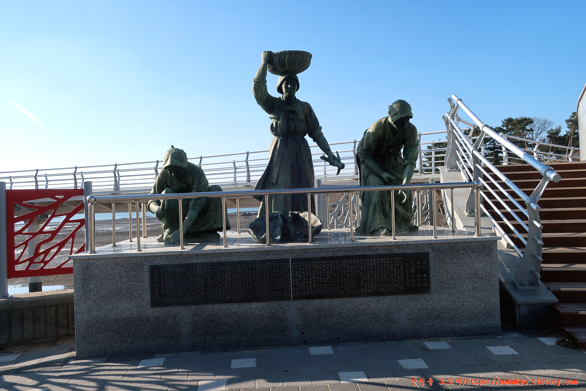 굴 모양의 조형물이 매달려 있고 기념탑 앞에는 굴을 채취하는 아낙네 세 명의