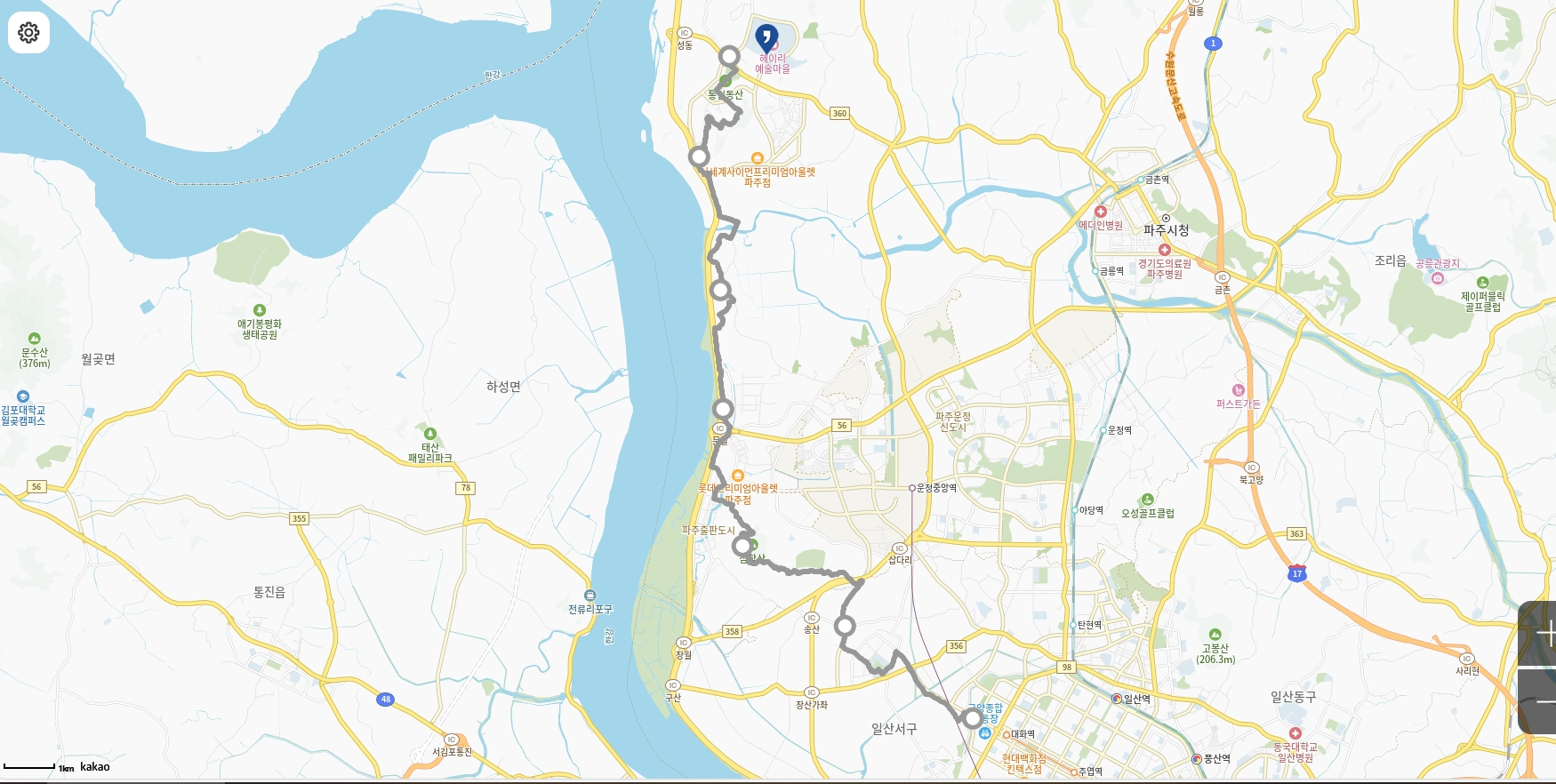 * 고양종합운동장-5.4km-심학산둘레길-4.2km-파주출판도시-5.7km-송촌교-5.4km-통일동산
