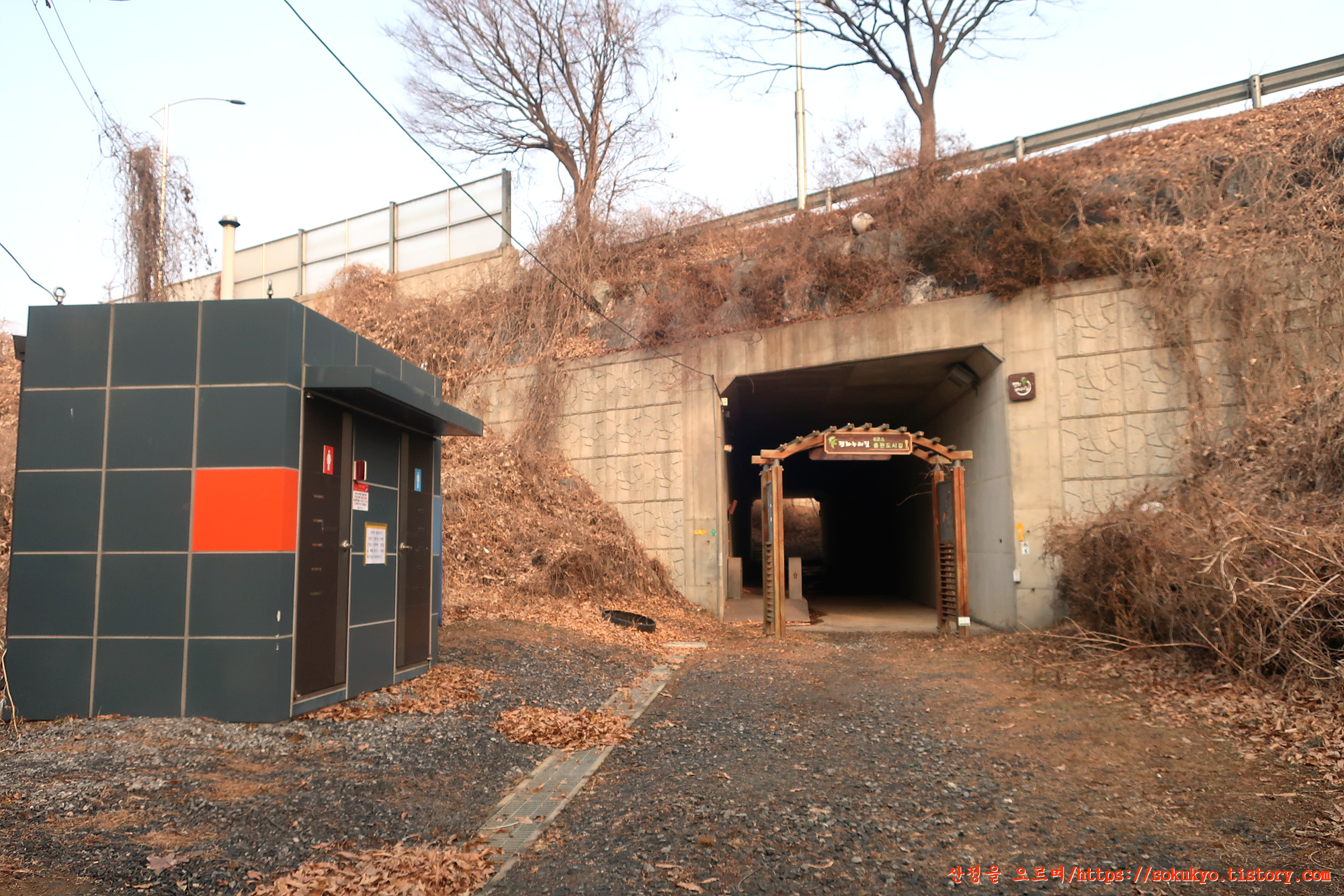 '동서대로' 하부통로 입구에는 간이화장실도 설치되어 있습니다.