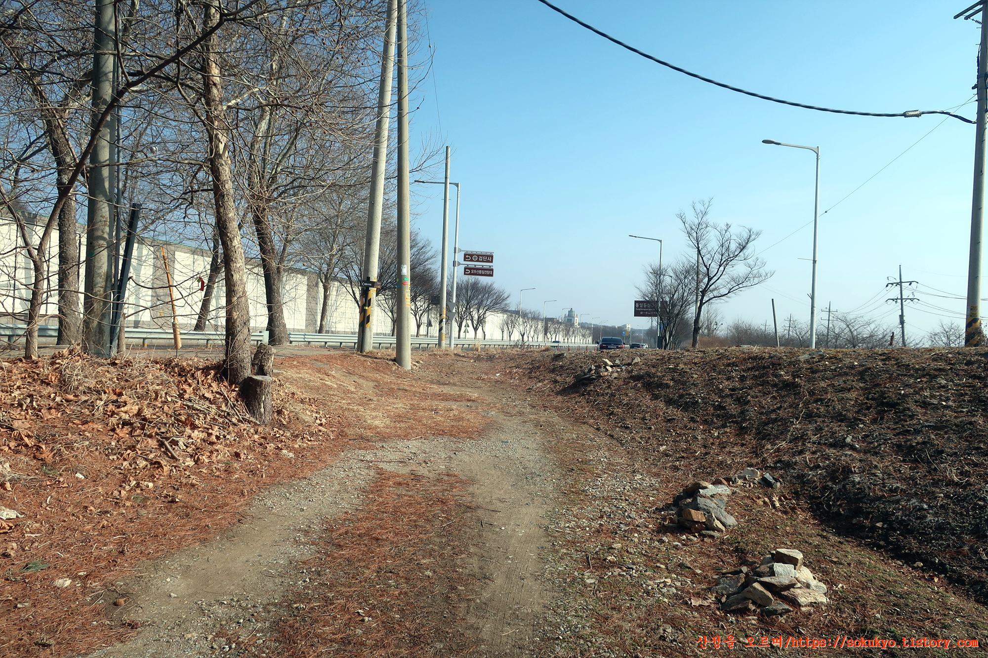 임도를 따라 야산을 넘어 내려가면 GS칼텍스 주유소가 있는 자유로가 보이는 곳에 닿습니다.
