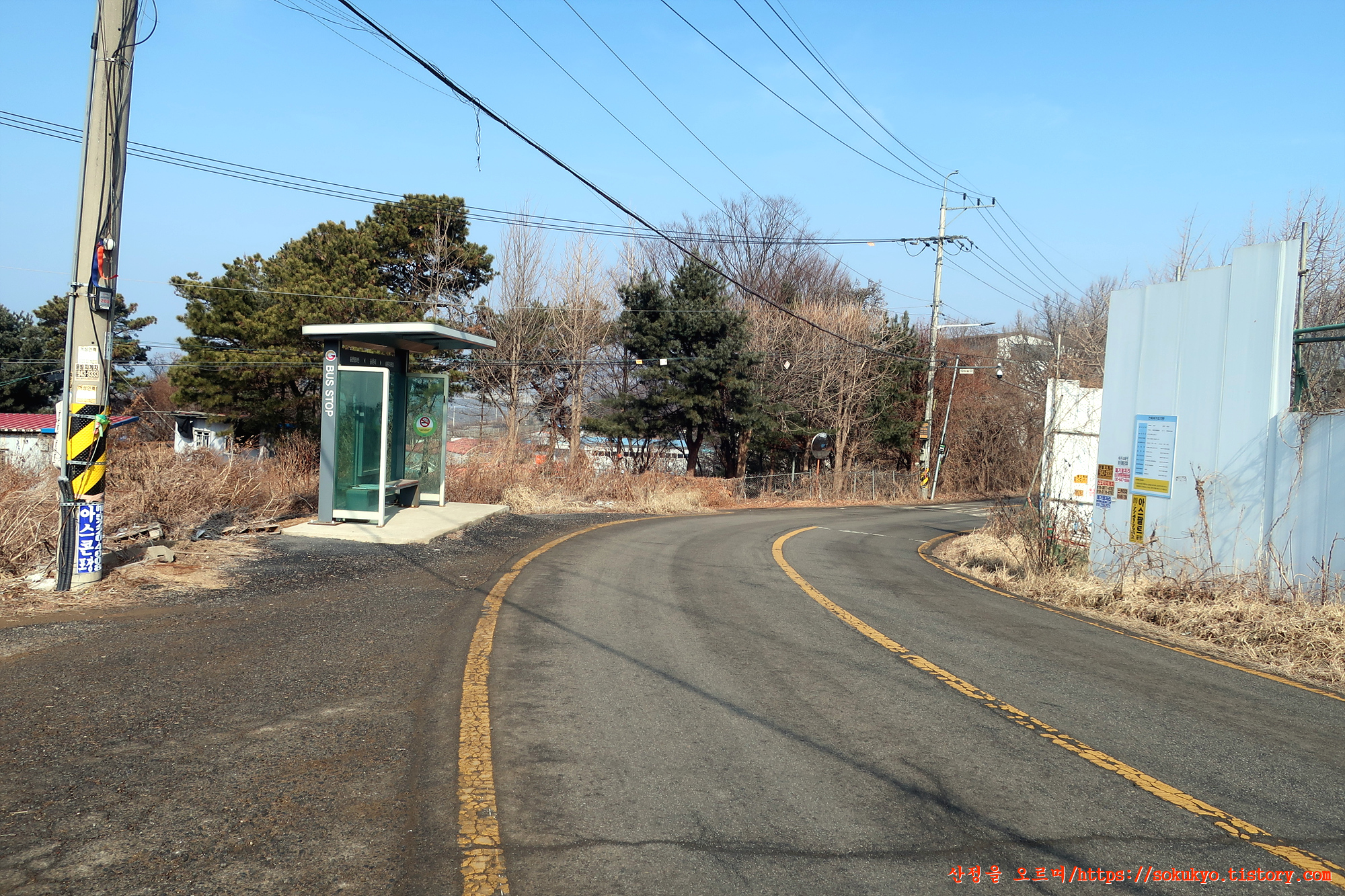 '송촌리 종점' 버스정류장에서 좌측으로 휘어져
